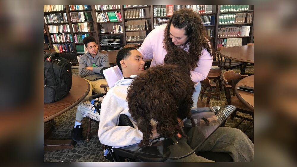 Members of the Oakwood High School student group Pups for People raised money to provide the labradoodle, part Labrador retriever and part poodle, to serve as Doucet’s emotional support dog.