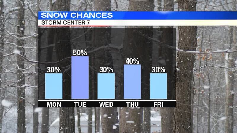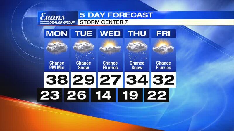 Monday: Mostly cloudy skies are expected with highs in the middle to upper 30s. There is the chance for a passing light rain shower in the afternoon, but most look to stay dry with a better chance for snow coming overnight into Tuesday.