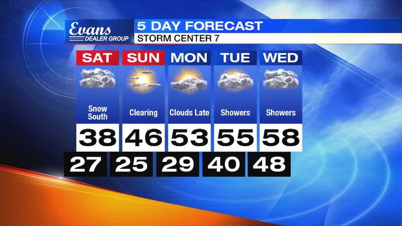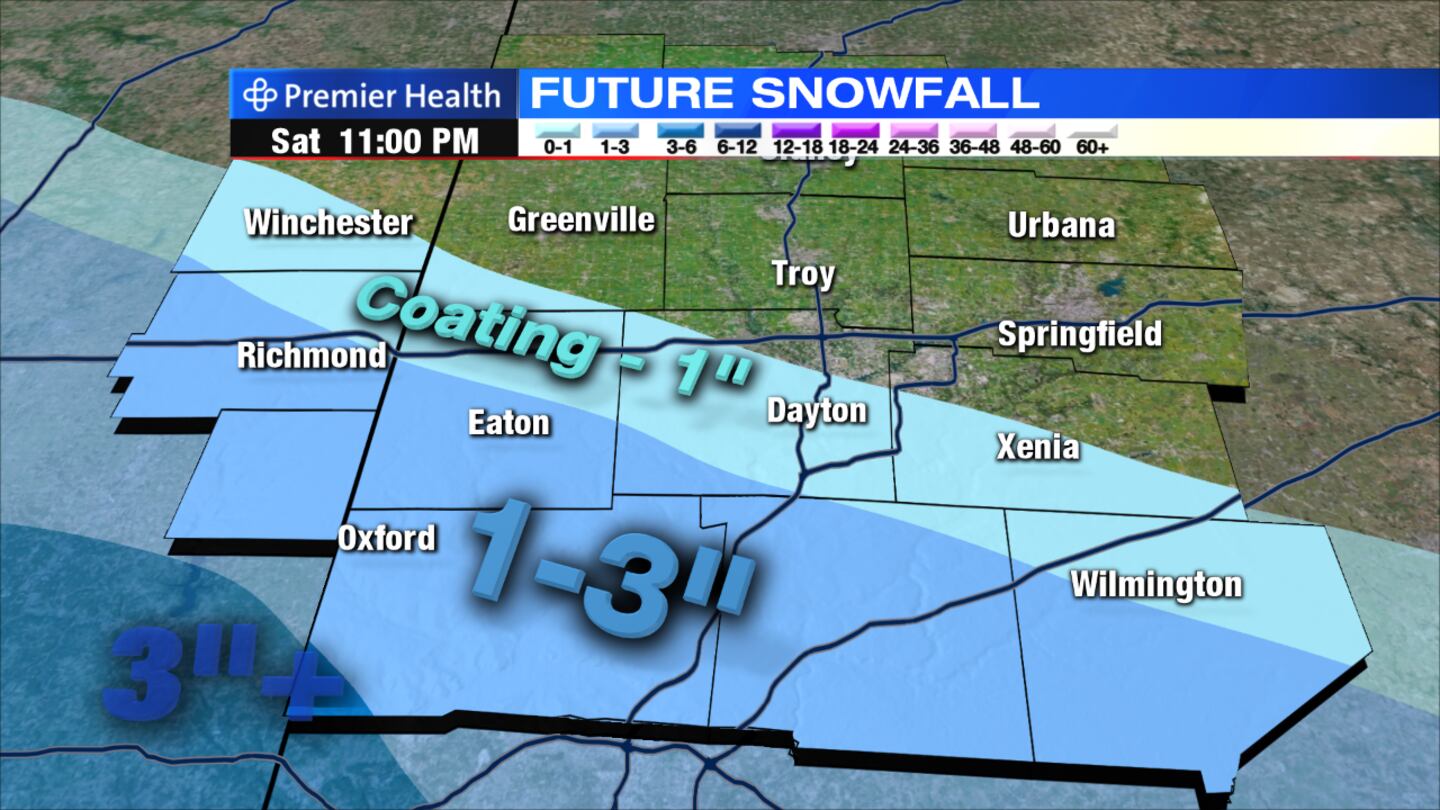 Saturday: Scattered snow will develop in the morning, mainly south of Interstate 70. Snow showers will be on and off into the evening. Little or no snow accumulation is expected north of I-70. Accumulation of 1 inch or less is expected across Preble, Montgomery and Clark and Greene Counties. Around 1 to 3 inches will be possible in Butler County along with southern Warren and Clinton counties. Highs will be in the upper 30s with breezy conditions at times.