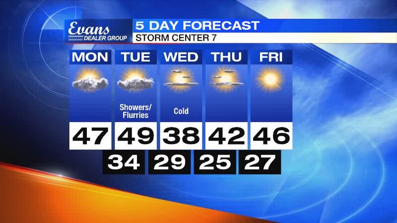 Wednesday: It will be cold again with temperatures in the morning in the 20s. A slick spot or two on bridges and overpasses can't be ruled out where there were showers. There will be mostly sunny skies. Highs will only reach the upper 30s, which is about 10 degrees colder than normal.