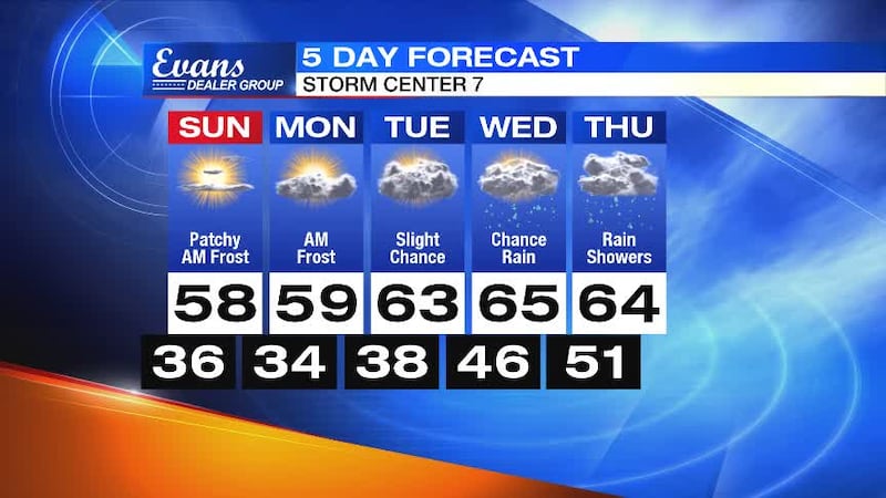 Monday: Frost is possible early. Temperatures will be in the middle, maybe even lower 30s before sunrise. More sunshine is expected during the day with highs in the upper 50s to near 60 degrees. A few more clouds will move in later.