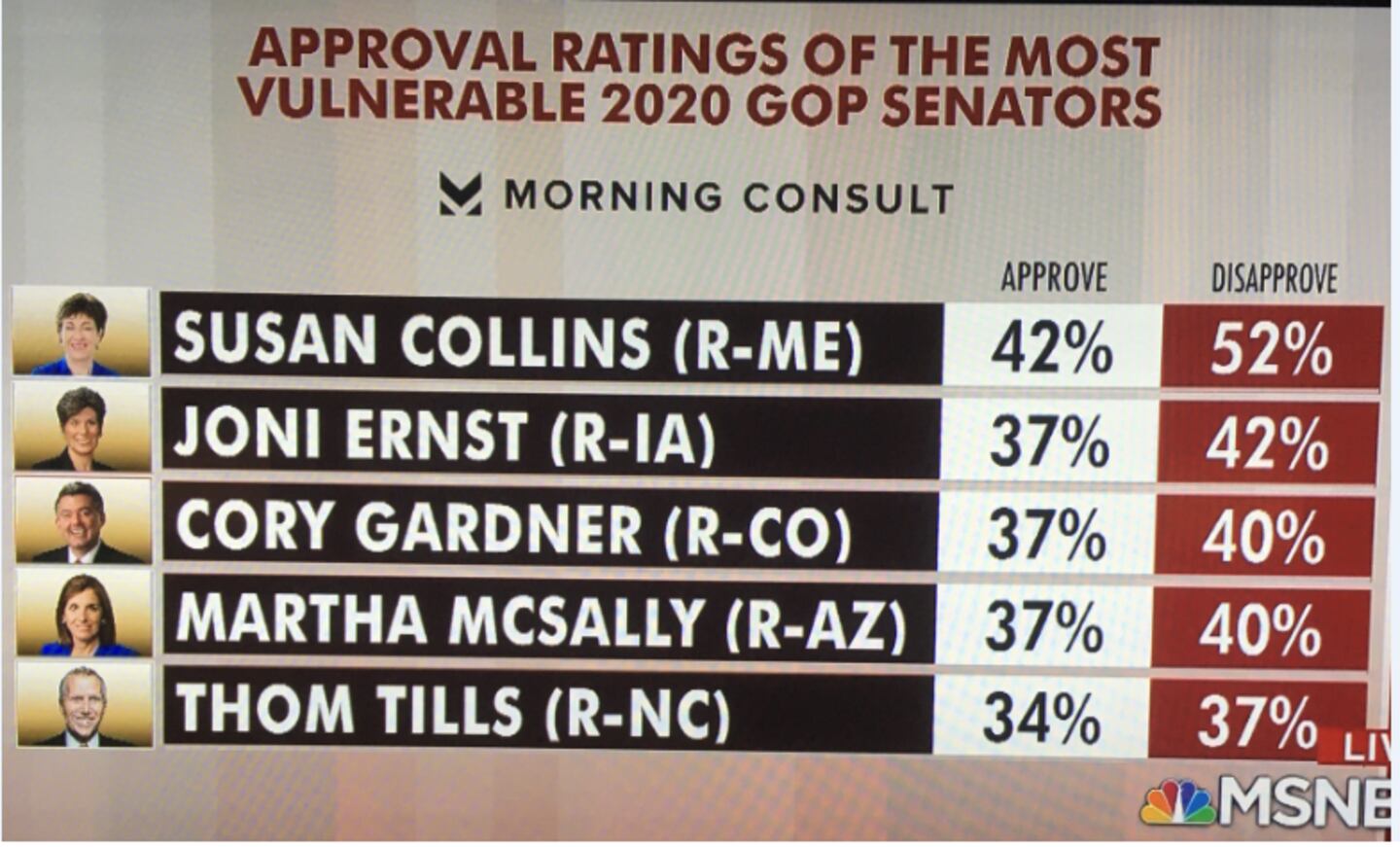 Polling shows that GOP Senators from three of those states - Sen. Susan Collins of Maine, Sen. Joni Ernst of Iowa, and Sen. Martha McSally of Arizona - have some of the worst approval/disapproval ratings in the country.