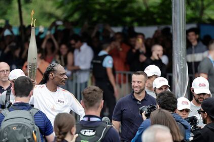 Snoop Dogg Olympics PARIS, FRANCE - JULY 26: US rapper Snoop Dogg walks as part of the 2024 Paris Olympic Games Torch Relay, in Saint-Denis on July 26, 2024 in Paris, France. (Photo by Stephane De Sakutin - Pool/Getty Images) (Pool/Getty Images)