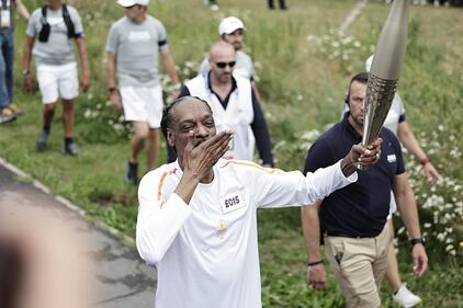 Snoop Dogg Olympics PARIS, FRANCE - JULY 26: US rapper Snoop Dogg holds the torch as part of the 2024 Paris Olympic Games Torch Relay, in Saint-Denis on July 26, 2024 in Paris, France. (Photo by Stephane De Sakutin - Pool/Getty Images) (Pool/Getty Images)