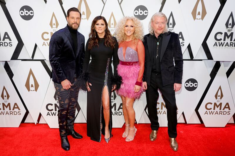 Photos: CMA Awards 2021 red carpet looks Jimi Westbrook, Karen Fairchild, Kimberly Schlapman and Phillip Sweet of Little Big Town attend the 55th annual Country Music Association Awards at the Bridgestone Arena on November 10, 2021, in Nashville, Tennessee. (Jason Kempin/Getty Images)