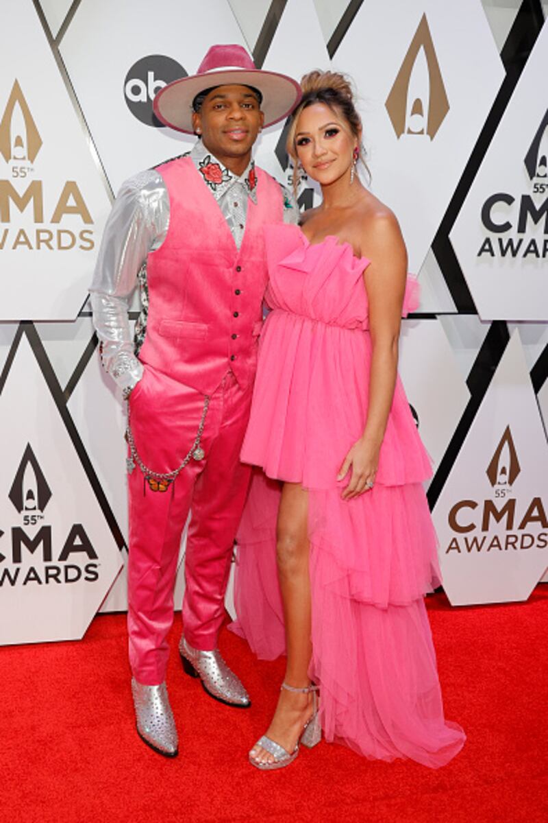 Photos: CMA Awards 2021 red carpet looks Jimmie Allen and Alexis Gale attend the 55th annual Country Music Association Awards at the Bridgestone Arena on November 10, 2021, in Nashville, Tennessee. (Jason Kempin/Getty Images)