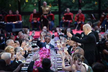 State dinner WASHINGTON, DC - MAY 23: WASHINGTON, DC - MAY 23: U.S. President Joe Biden toasts Kenyan President William Ruto during a State Dinner at the White House on May 23, 2024 in Washington, DC. Biden is hosting President Ruto and his wife Rachel Ruto for a state visit, which included a bilateral meeting, a joint press conference and state dinner. Ruto’s visit is the first official state visit to the White House by a leader from an African country since 2008. (Photo by Win McNamee/Getty Images) (Win McNamee/Getty Images)