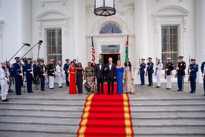 State dinner WASHINGTON, DC - MAY 23: U.S. President Joe Biden and first lady Jill Biden pose with Kenyan President William Ruto (C), his wife Rachel Ruto (3rd-L) and their children as they arrive for a State Dinner at the White House on May 23, 2024 in Washington, DC. Biden is hosting President Ruto and his wife Rachel Ruto for a state visit, which included a bilateral meeting, a joint press conference and state dinner. Ruto's visit is the first official state visit to the White House by a leader from an African country since 2008. (Photo by Andrew Harnik/Getty Images) (Andrew Harnik/Getty Images)