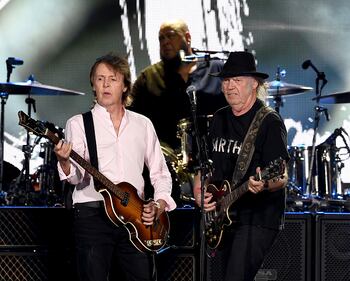 Photos: Neil Young through the years 2016: Sir Paul McCartney (left) and Neil Young perform onstage during Desert Trip at the Empire Polo Field on October 8, 2016, in Indio, California. (Kevin Winter/Getty Images)
