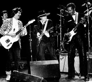 Photos: Neil Young through the years 1986: Keith Richards of the Rolling Stones, left, Neil Young, center, and Chuck Berry perform together at the finale of the Rock and Roll Hall of Fame Awards in New York City on Jan. 24, 1986. (AP Photo/Frankie Ziths)