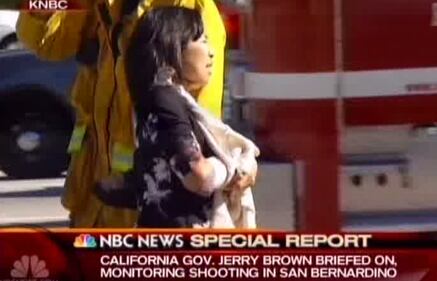 Shooting in San Bernardino A woman holds her arm as first responders attend to people outside a Southern California social services center in San Bernardino, Calif., where one or more gunmen opened fire, shooting multiple people on Wednesday, Dec. 2, 2015. (KNBC via AP) TV OUT