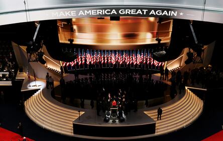 RNC Day 4 CLEVELAND, OH - JULY 21: Republican presidential candidate Donald Trump (C) tests the teleprompters and microphones on stage before the start of the fourth day of the Republican National Convention on July 21, 2016 at the Quicken Loans Arena in Cleveland, Ohio. Ivanka Trump will introduce her father before he gives his acceptance speech tonight, the final night of the convention. (Photo by Chip Somodevilla/Getty Images) (Chip Somodevilla)