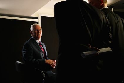 RNC Day 4 CLEVELAND, OH - JULY 21: Republican vice presidential candidate Mike Pence prepares for an interview with the media prior to the start of the fourth day of the Republican National Convention on July 21, 2016 at the Quicken Loans Arena in Cleveland, Ohio. An estimated 50,000 people are expected in Cleveland, including hundreds of protesters and members of the media. The four-day Republican National Convention kicks off on July 18. (Photo by Alex Wong/Getty Images) (Alex Wong)