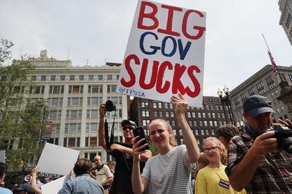 RNC Day 4 CLEVELAND, OH - JULY 21: A group of anarchists and pro-capitalists pursue each near the site of the Republican National Convention (RNC) on the last day of the convention on July 21, 2016 in Cleveland, Ohio. Many people have stayed away from downtown due to road closures and the fear of violence. The four-day Republican National Convention kicked off on July 18. (Photo by Spencer Platt/Getty Images) (Spencer Platt)
