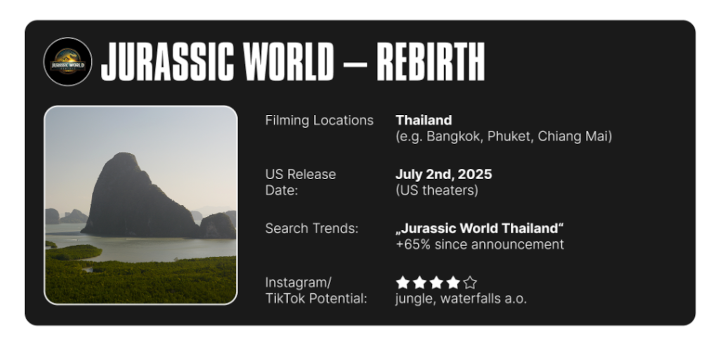 Thailand’s population of 66 million welcomed 35 million tourists to the country in 2024. Even if “White Lotus” doesn’t flood Thailand with tourists, “Jurassic World: Rebirth” just might. Despite being set on a fictional tropical island, the latest release from the “Jurassic” franchise prominently features breathtaking scenery from sites in Krabi, Thailand, like Ao Phang Nga National Park, Khao Phanom Bencha National Park, and Ko Kradan.