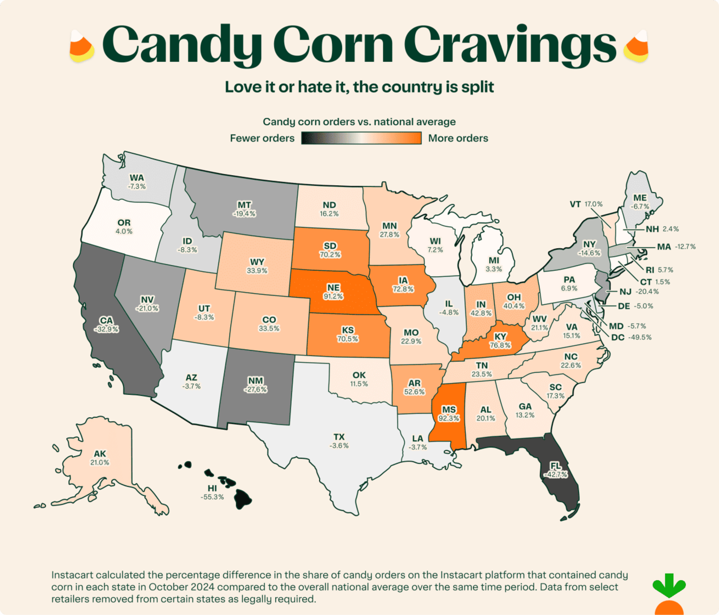 - The least enthusiastic: On the flip side, Hawai'i ordered candy corn 55% less often than average, followed by Washington D.C. (-50%) and Florida (-43%).