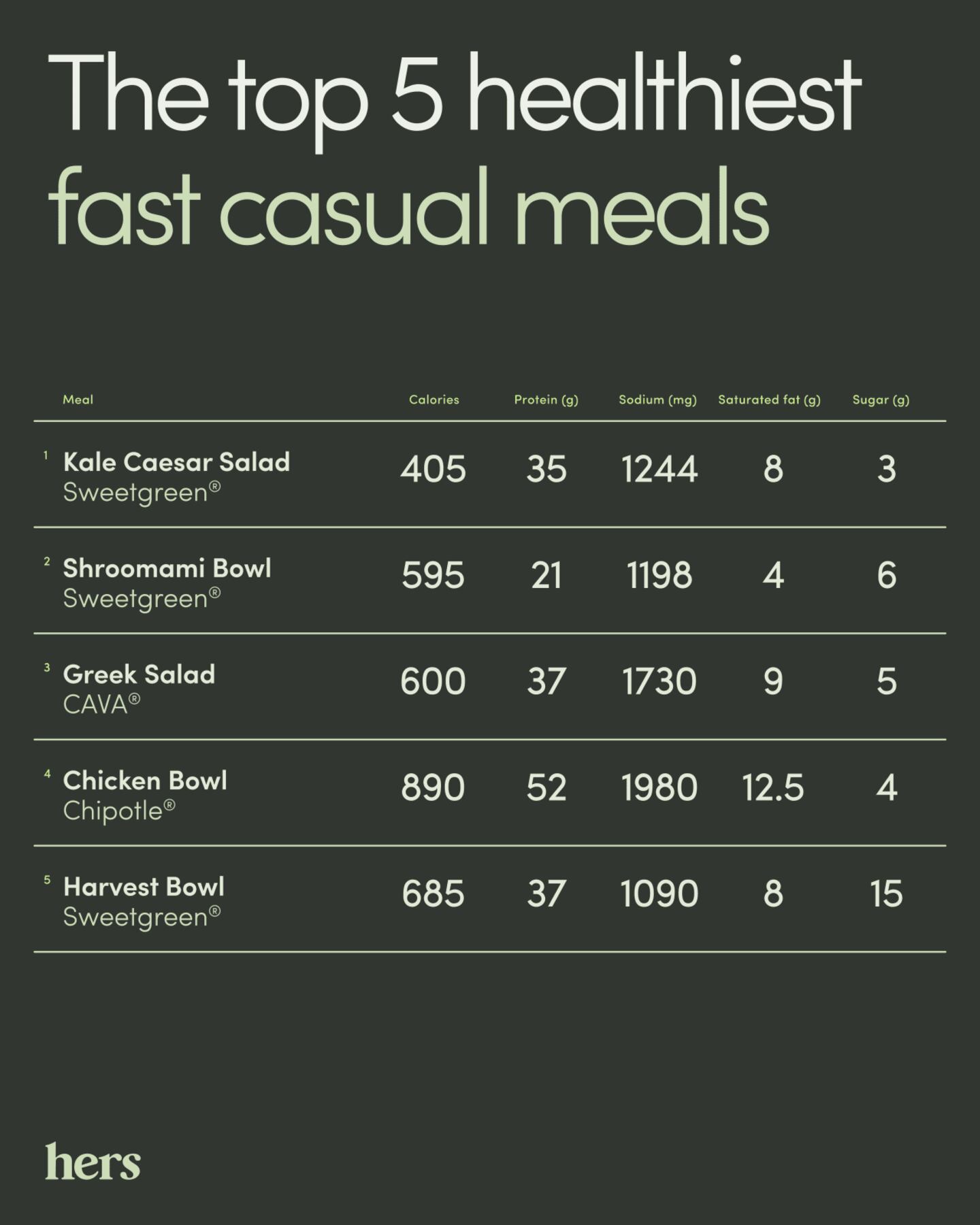 After giving each nutrition category a score from one to 16, Hers ranked menu items lower with more saturated fat, calories, sugar, and sodium, whereas meals with more protein were ranked higher. From there, Hers averaged the rankings in each nutrition category. In instances where menu items had the same overall score, meals with more protein broke the tie, given their effect on satiety. Get the data here.