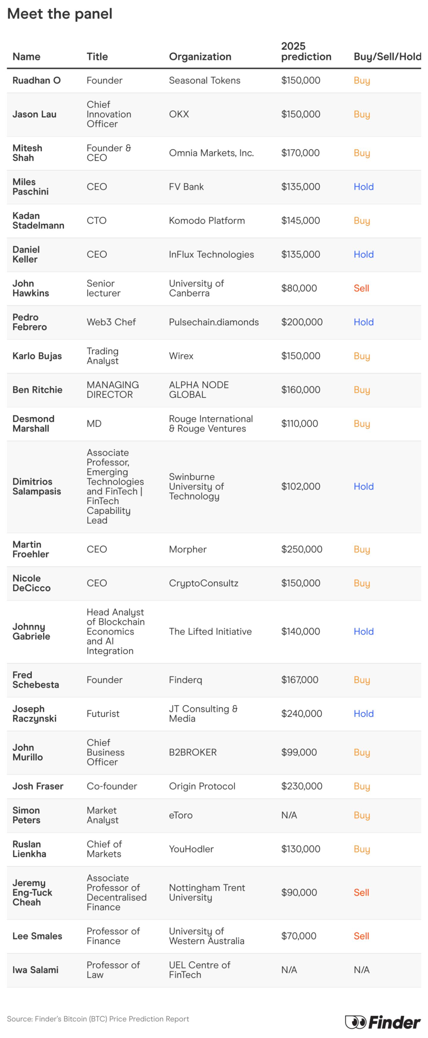 Bitcoin’s price is expected to rise to $145,167 by year-end 2025, according to the average prediction from Finder’s panelists.