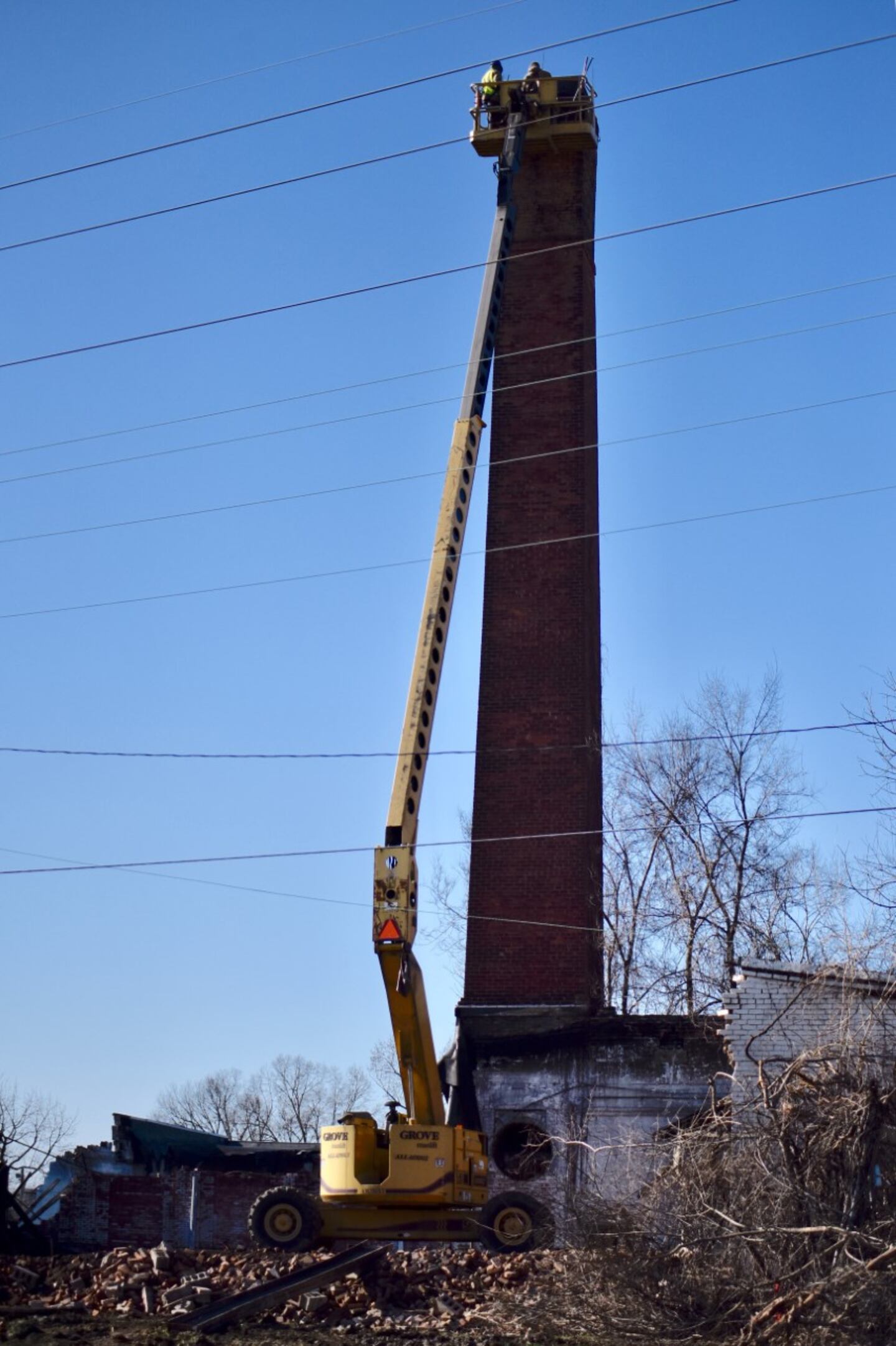 Vickers crews were on heavy equipment on the Park Street side of the facility moving the debris and looking for more hotspots. Another crew could be seen on an aerial platform chipping away the bricks on both smoke stacks as they prepare to bring them down on Monday.