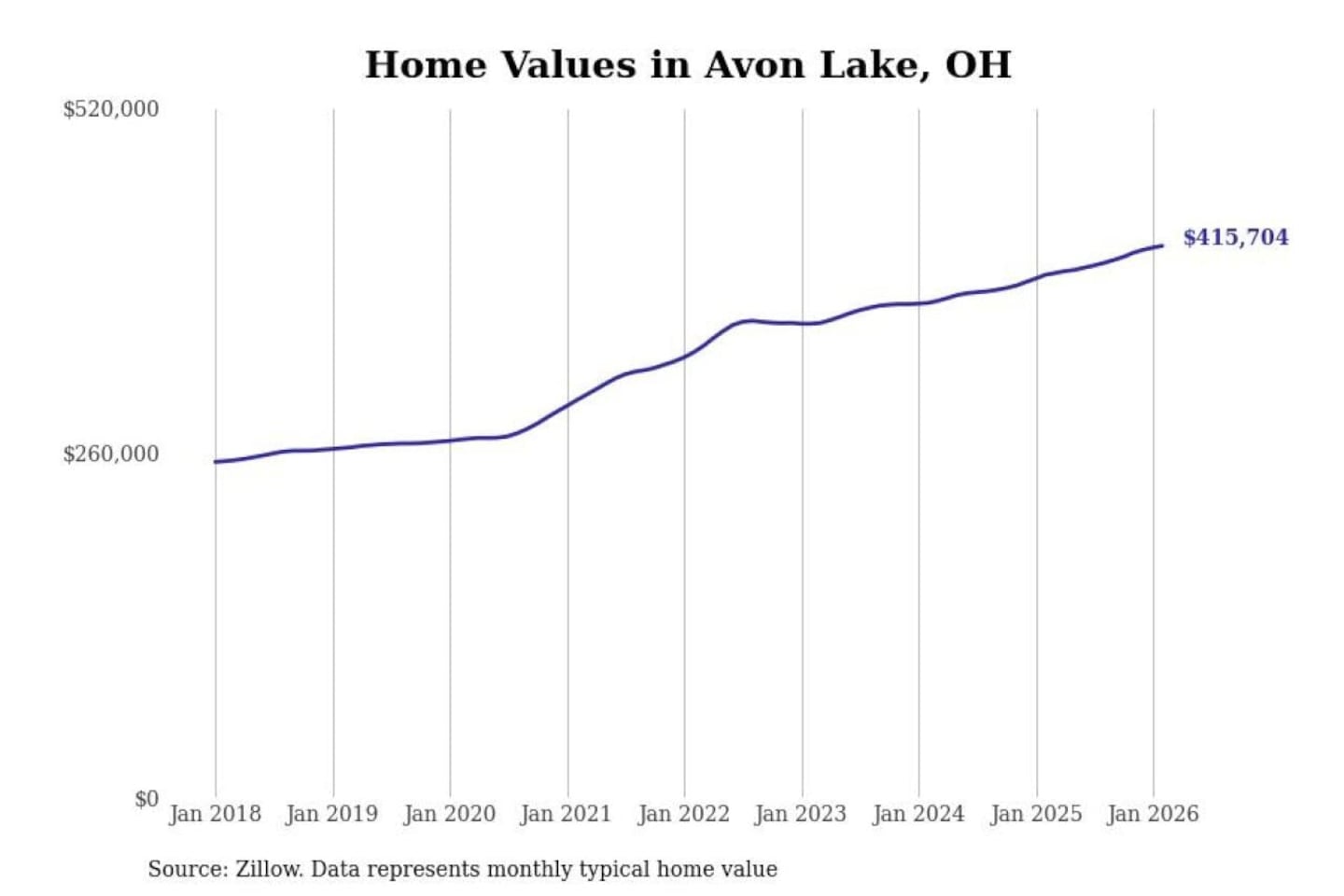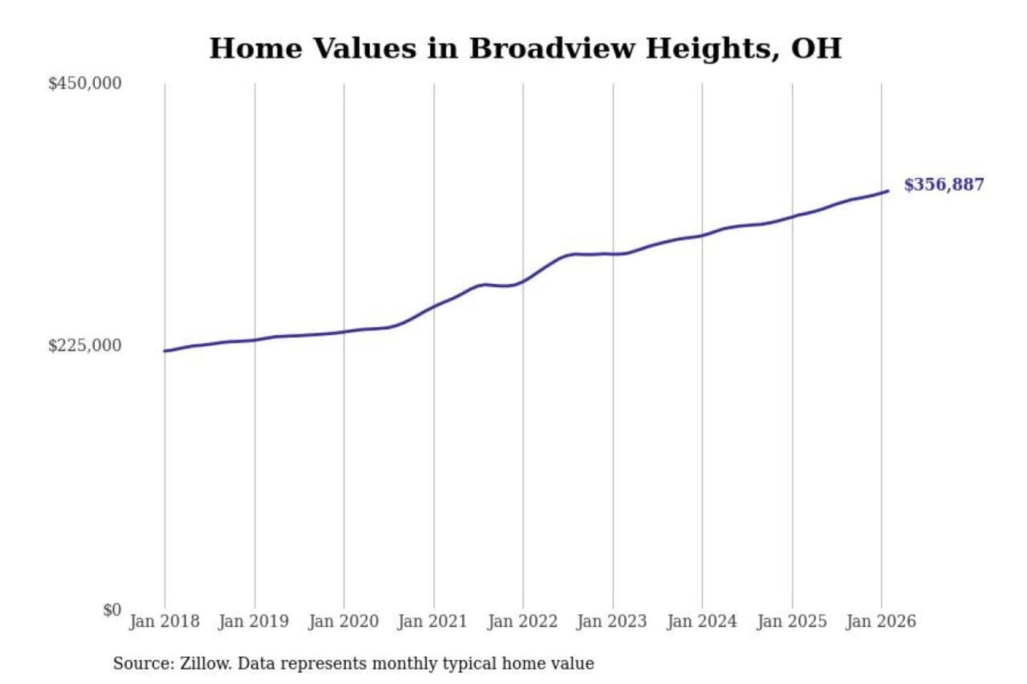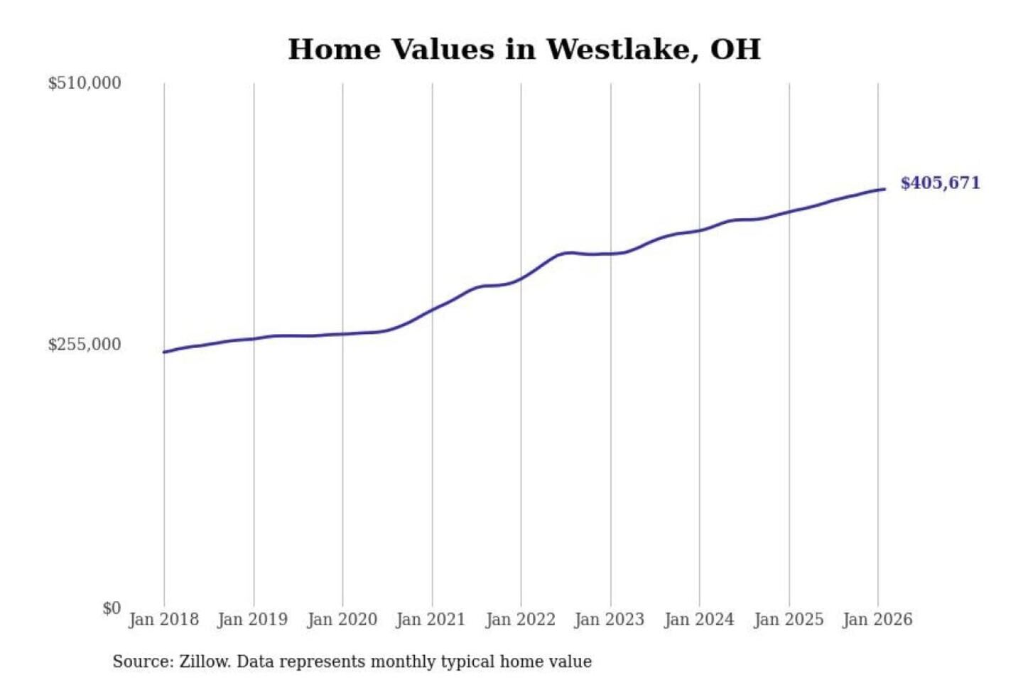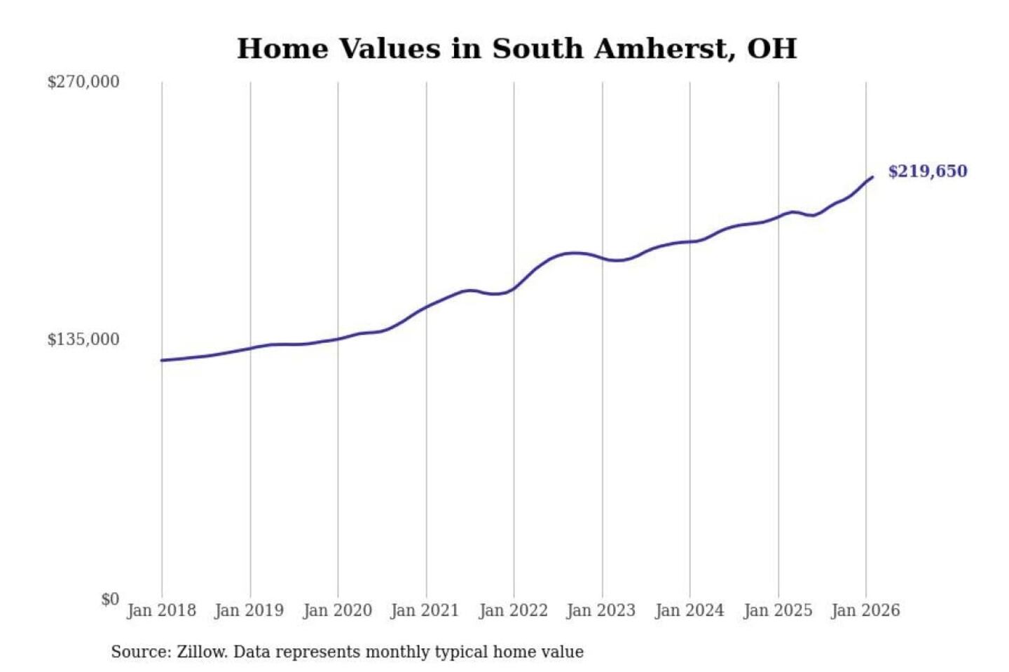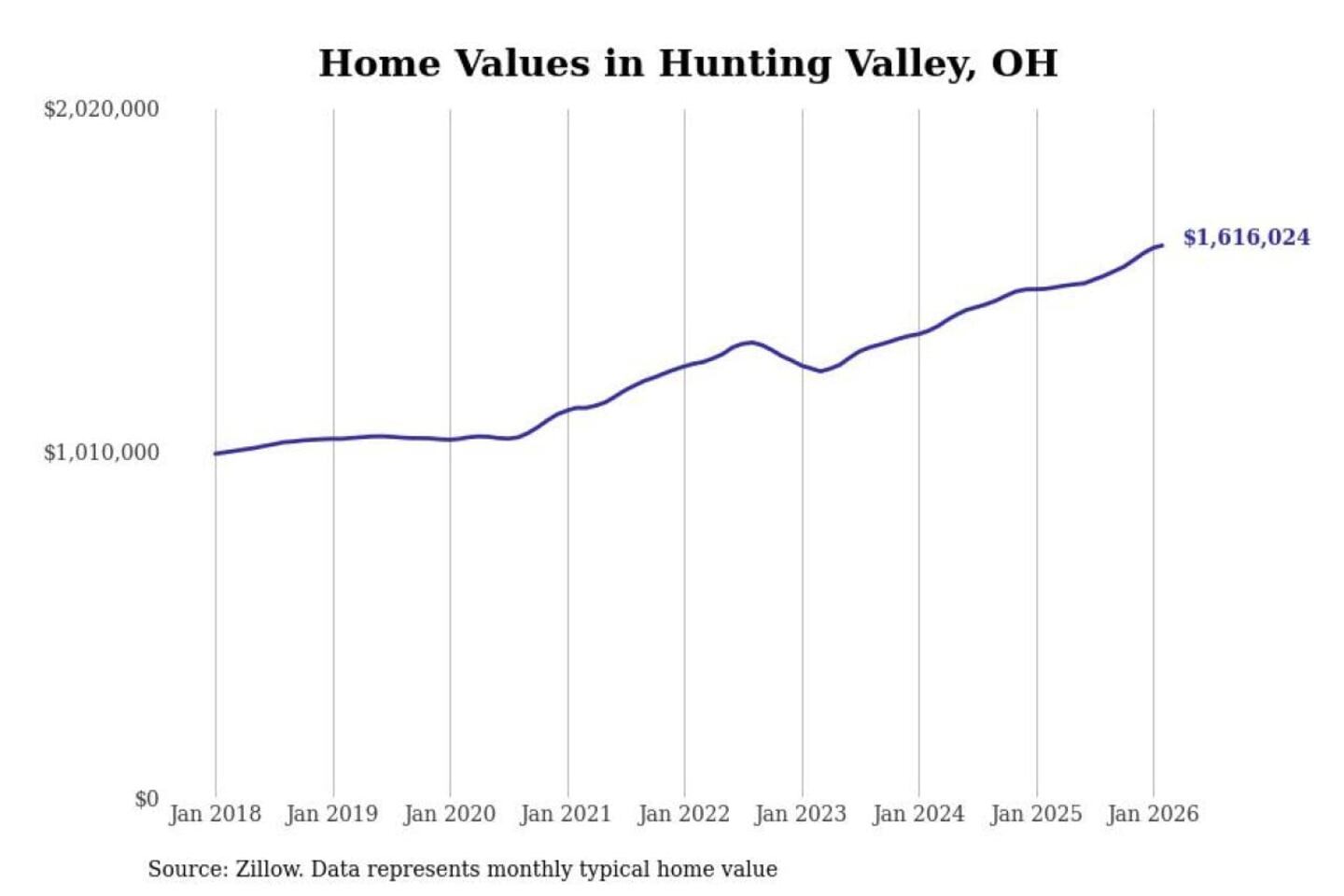 Stacker compiled a list of cities with the most expensive homes in the Cleveland-Elyria, OH metro area using data from Zillow. Charts show the monthly typical home value since January 2018.