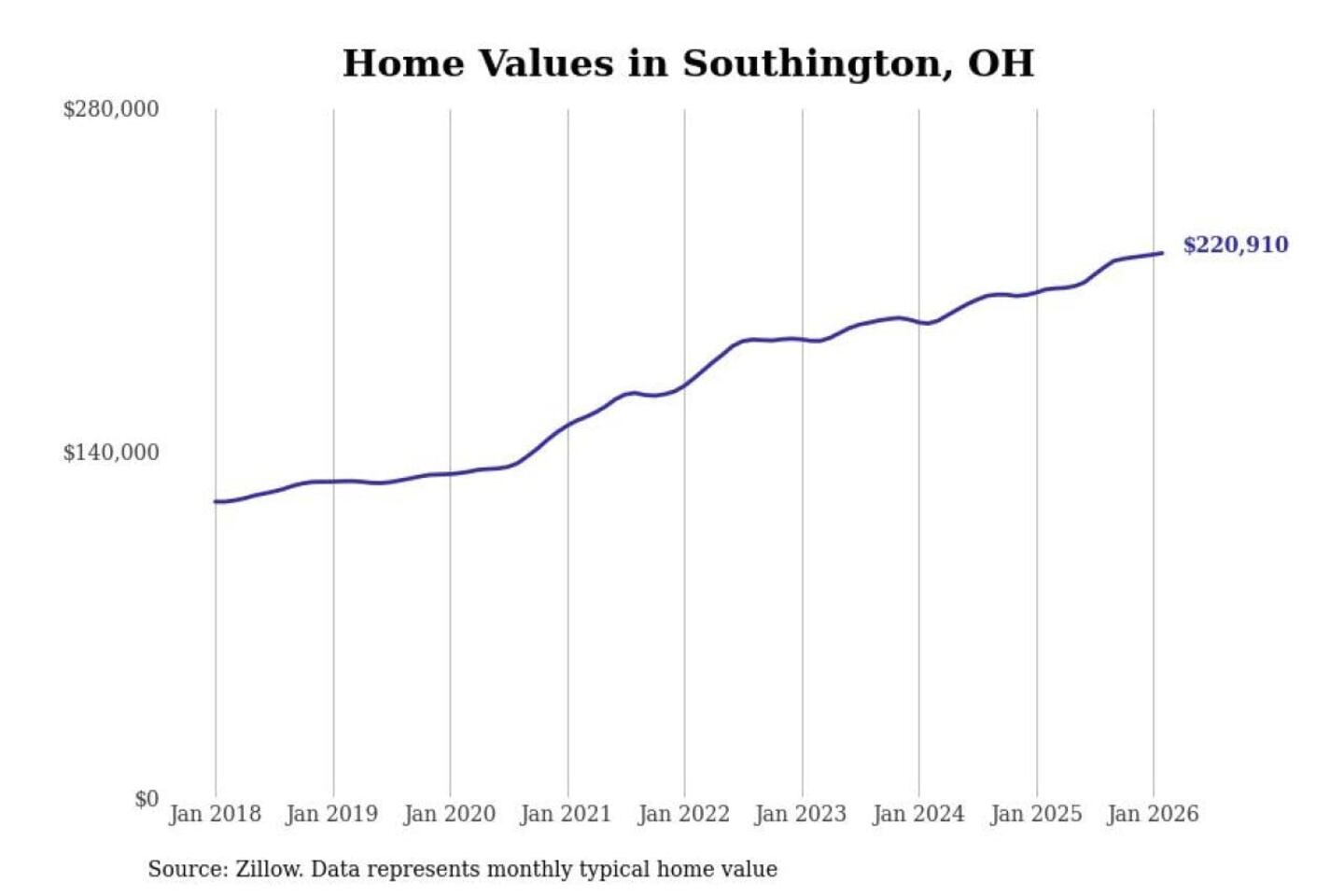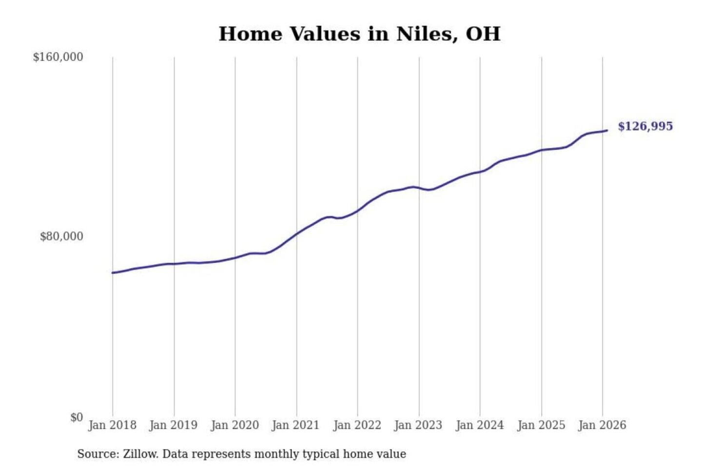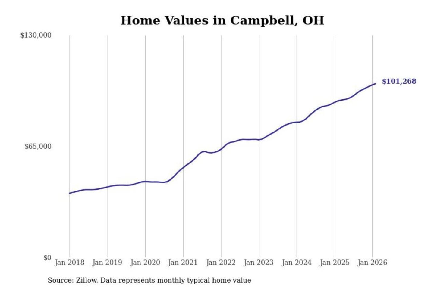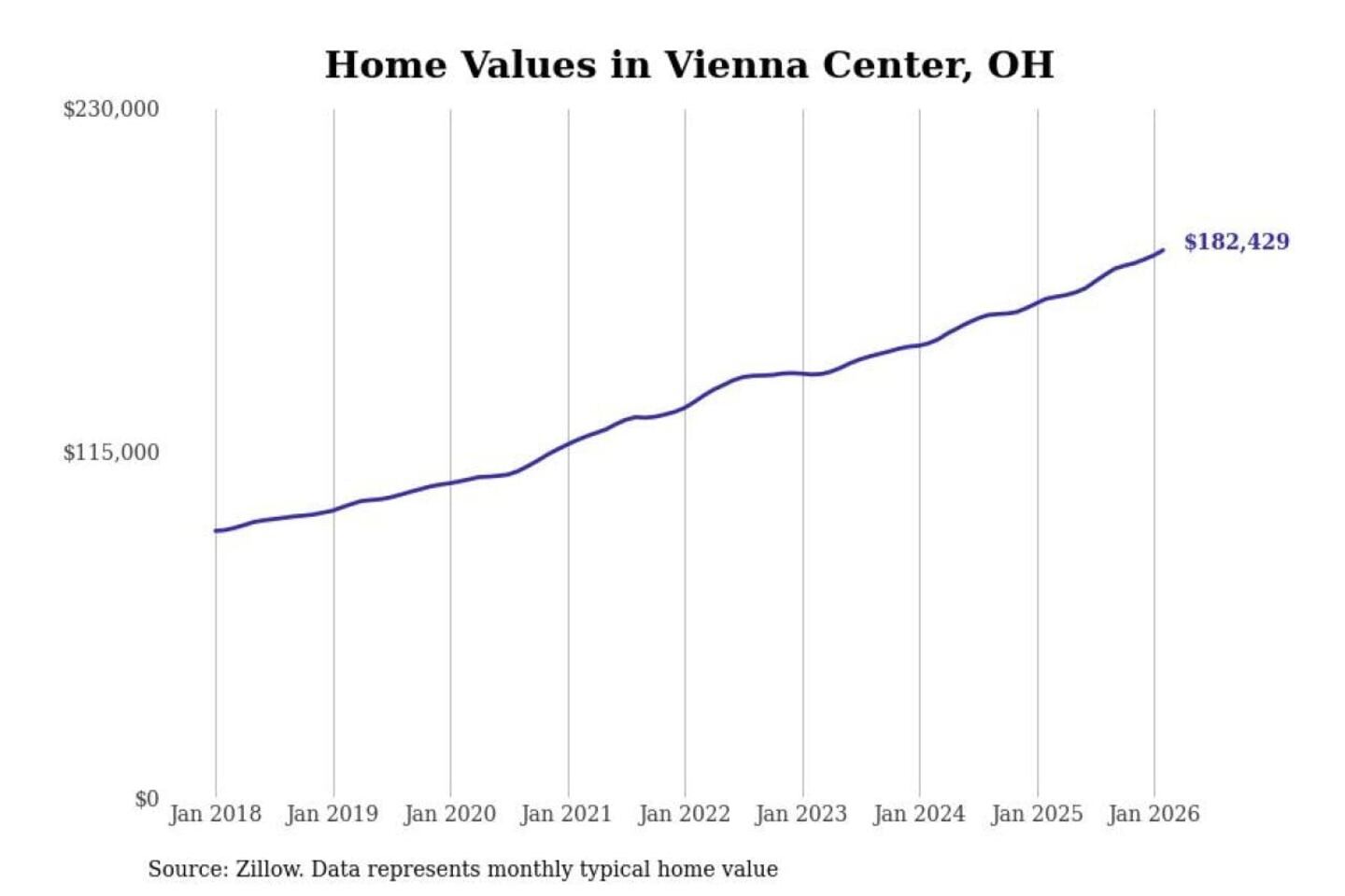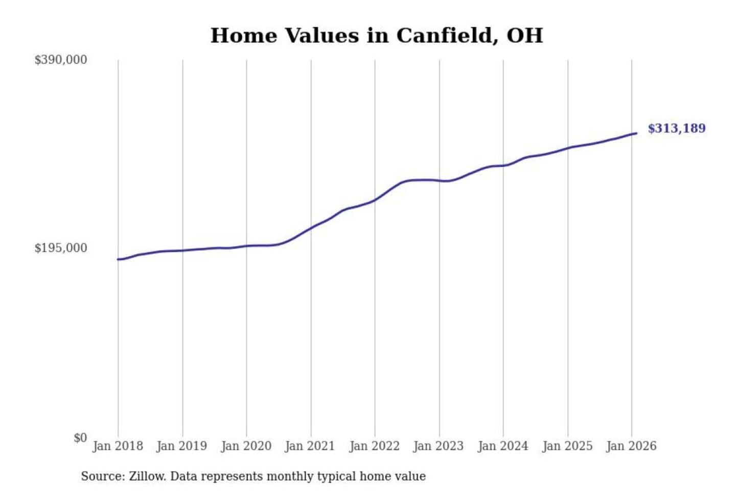 Stacker compiled a list of cities with the most expensive homes in the Youngstown-Warren-Boardman, OH-PA metro area using data from Zillow. Charts show the monthly typical home value since January 2018.