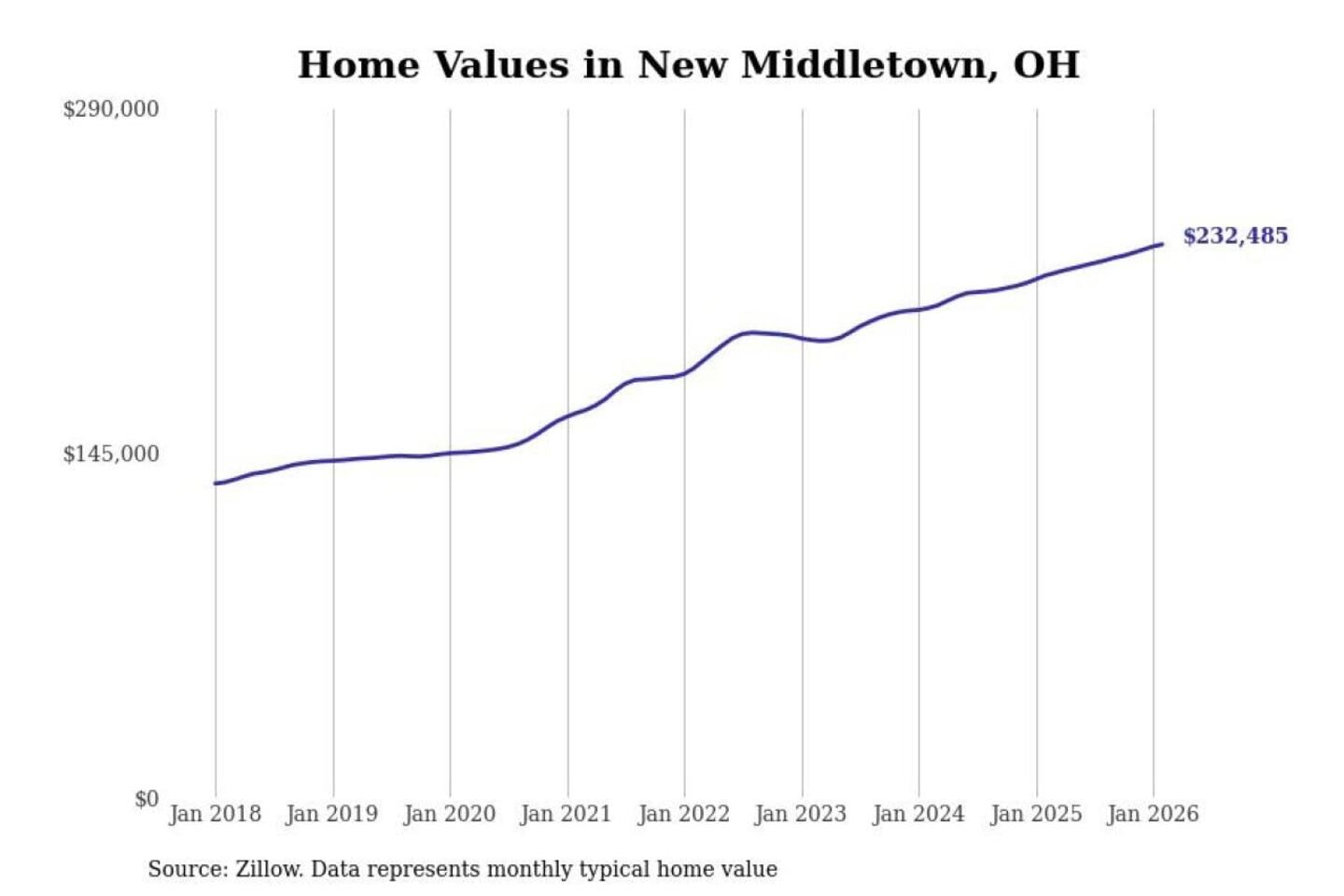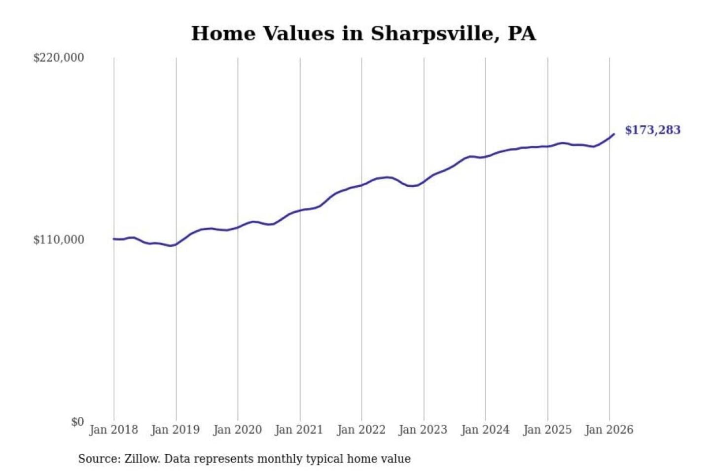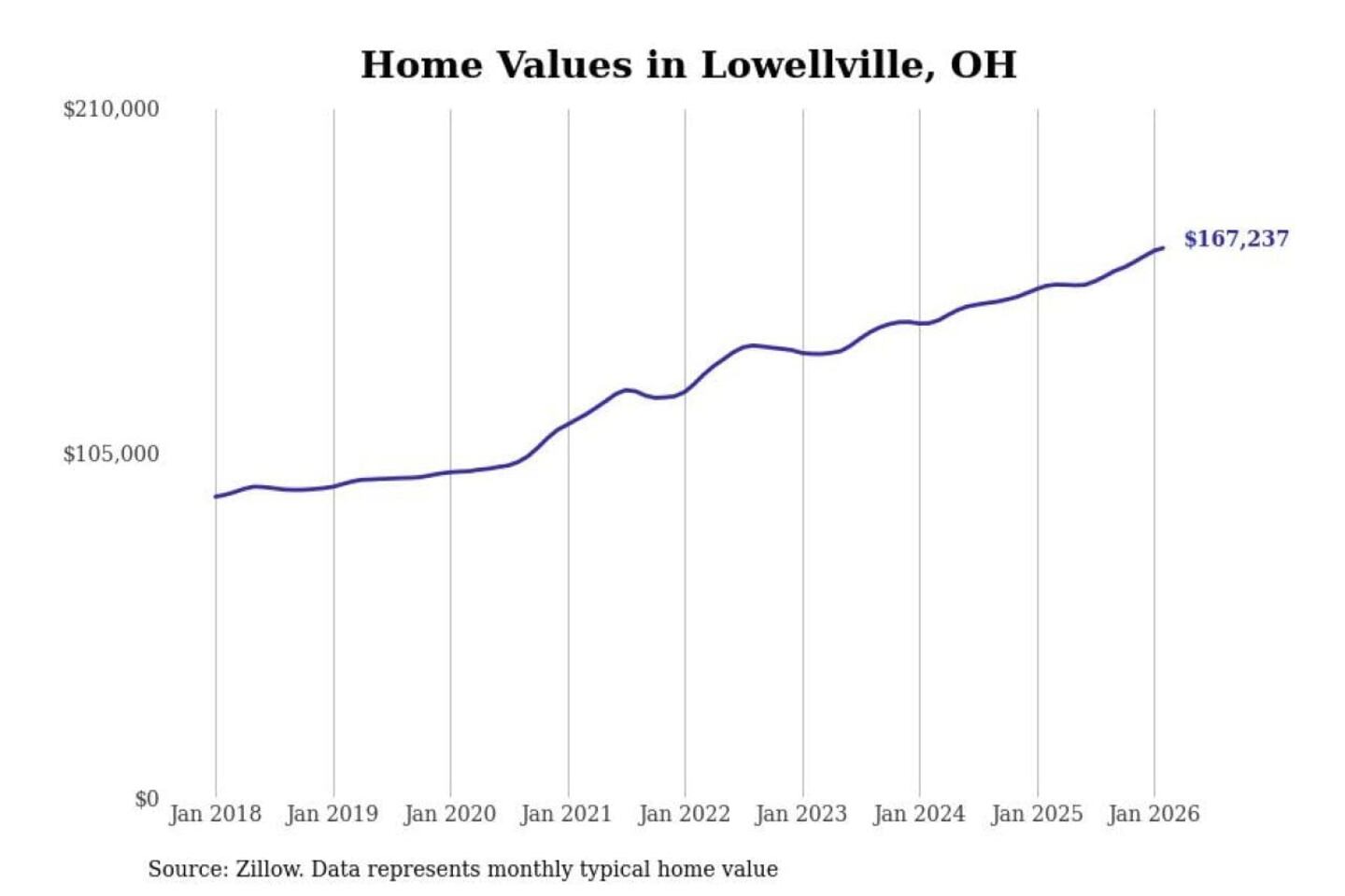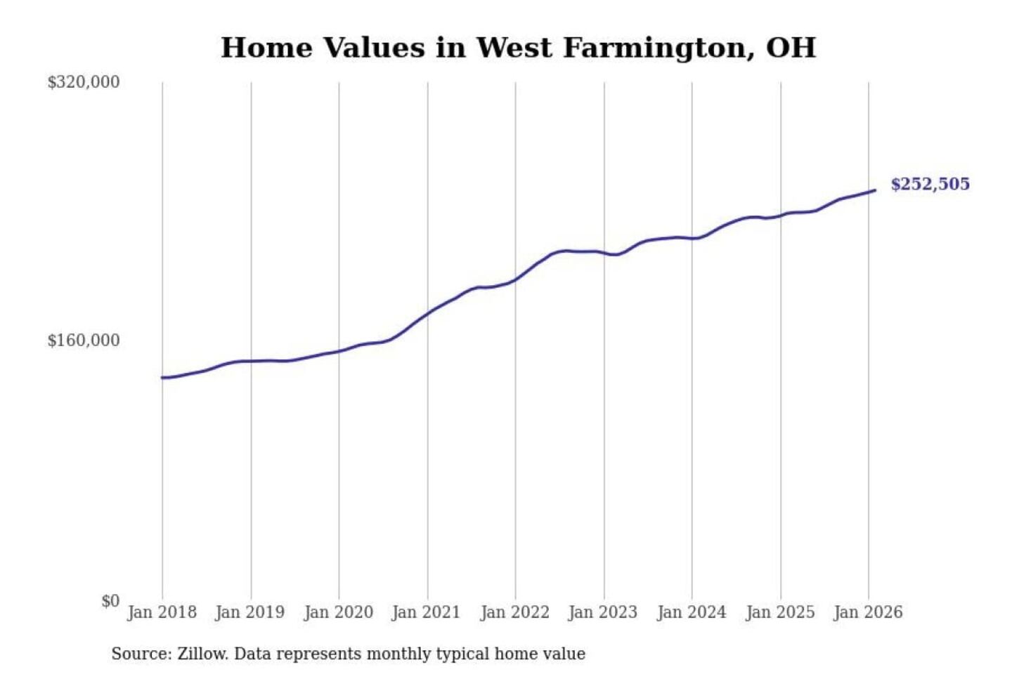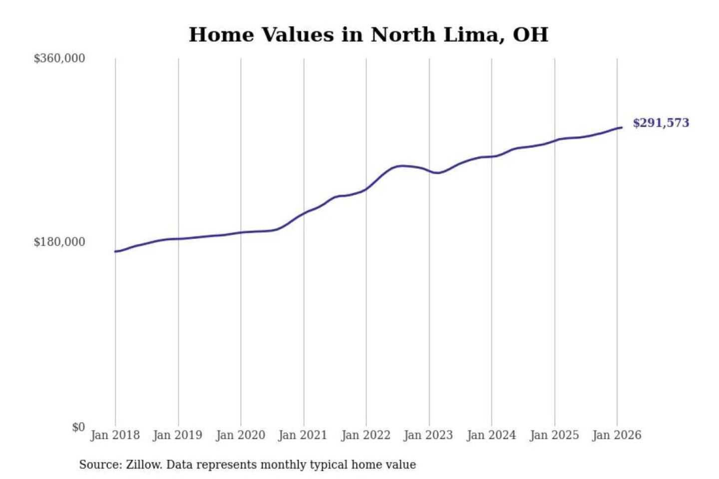 Stacker compiled a list of cities with the most expensive homes in the Youngstown-Warren-Boardman, OH-PA metro area using data from Zillow. Charts show the monthly typical home value since January 2018.