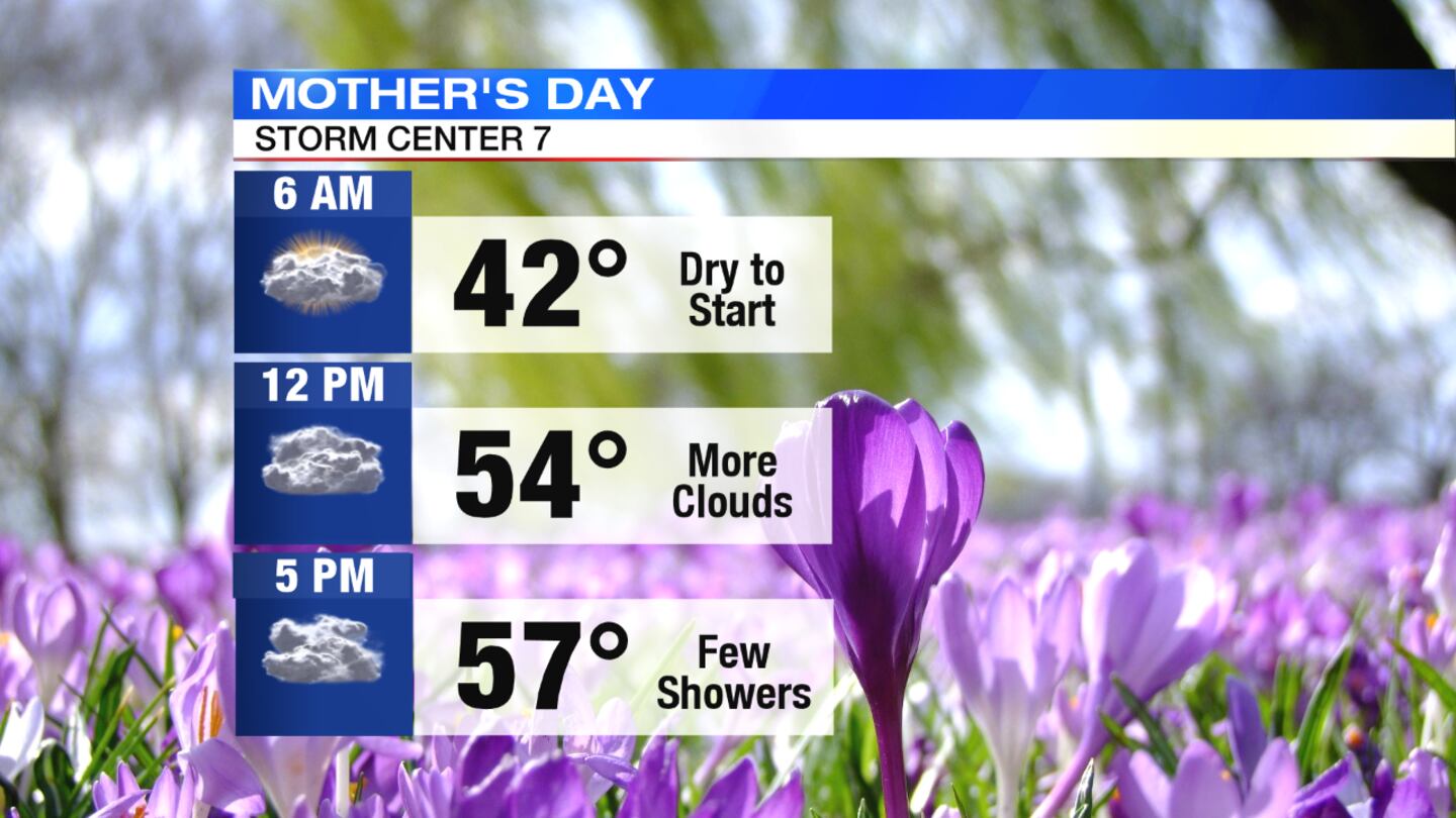 MOTHER’S DAY: Another chilly morning with temperatures starting in the upper 30s. Clouds increase quickly during the day with highs reaching around 60 degrees.