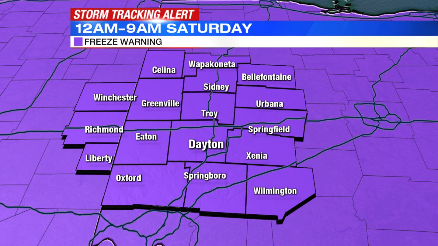 SATURDAY: A Freeze Warning has been issued for the Miami Valley from midnight to 9 a.m. Saturday as temperatures drop into the upper 20s, likely breaking the record low temperature for the day.