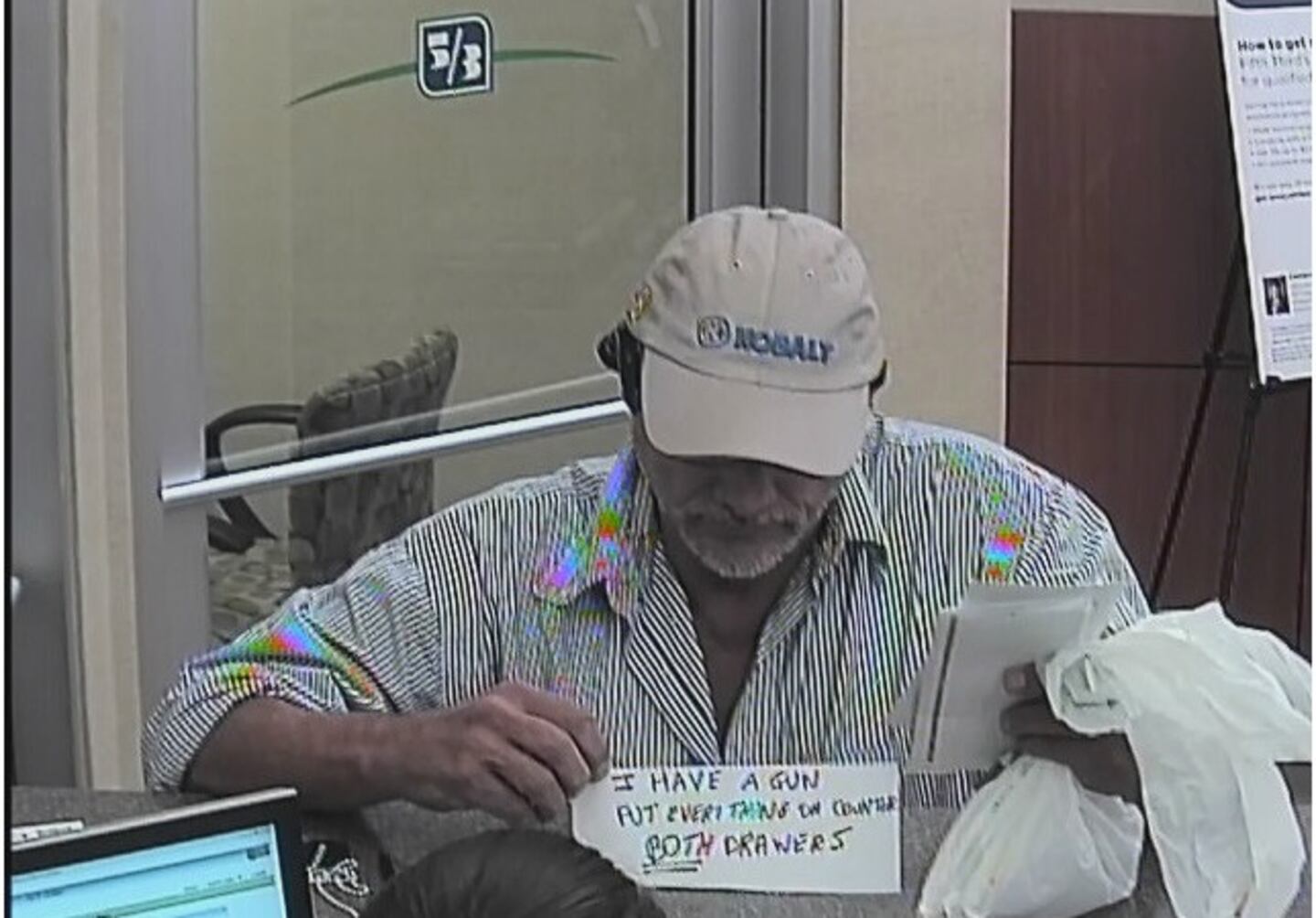 He entered the bank around 6 p.m. inside Kroger, 155 N. Heineke Road. He is described as a tall, thin man with gray facial hair in his middle to late 50s. He had a black bandanna underneath a ball cap and was wearing glasses, according to a 911 caller.
