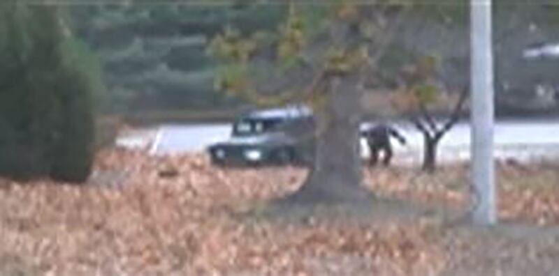 Muzzles flash. The North Korean soldiers, one of whom drops flat into the leaves, fire at the defector at close range with handguns and AK-47 assault rifles — about 40 rounds, the South says.