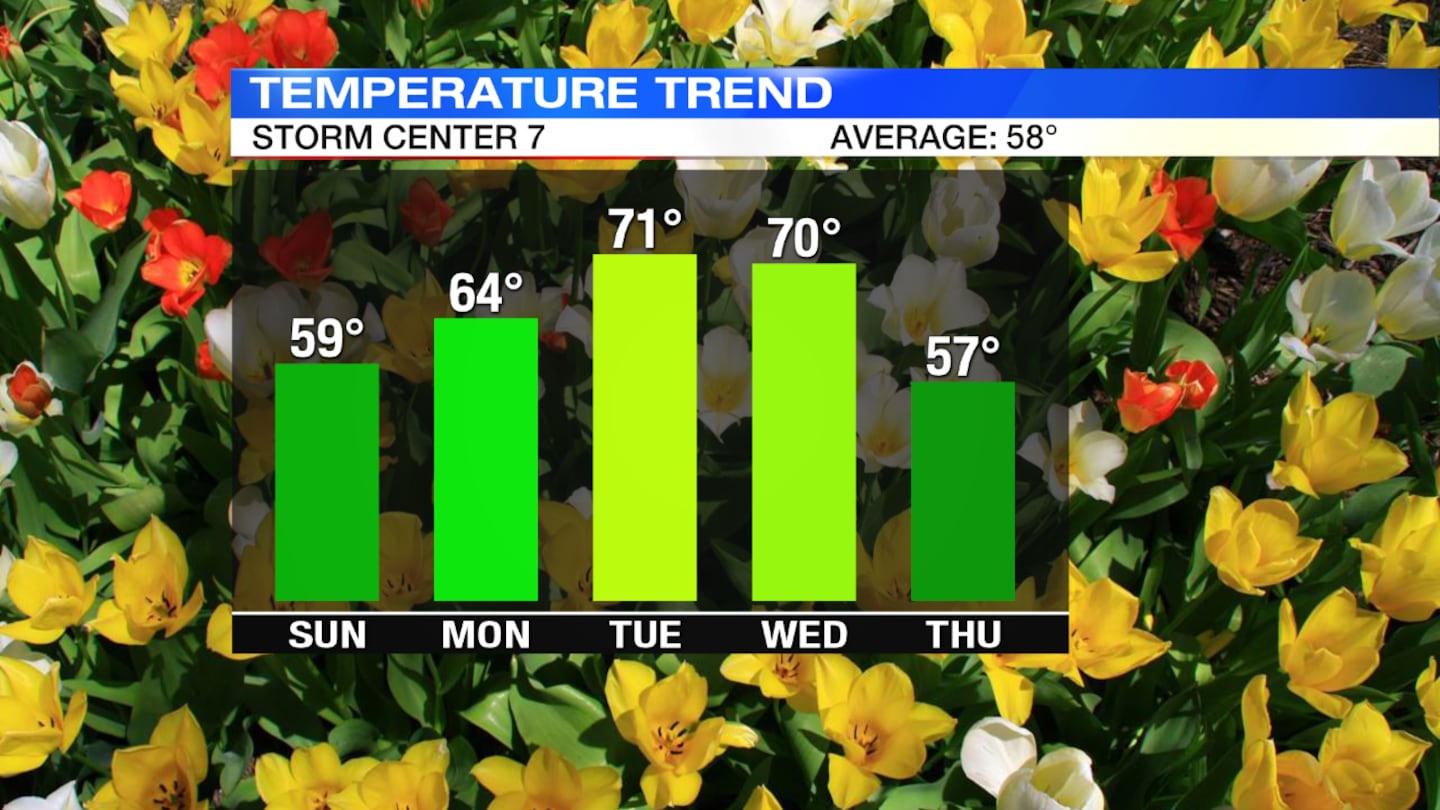 WEDNESDAY: There is a chance of a few passing showers or an isolated storm early, then it will be partly sunny. Highs will near 70 degrees and rain will return overnight.