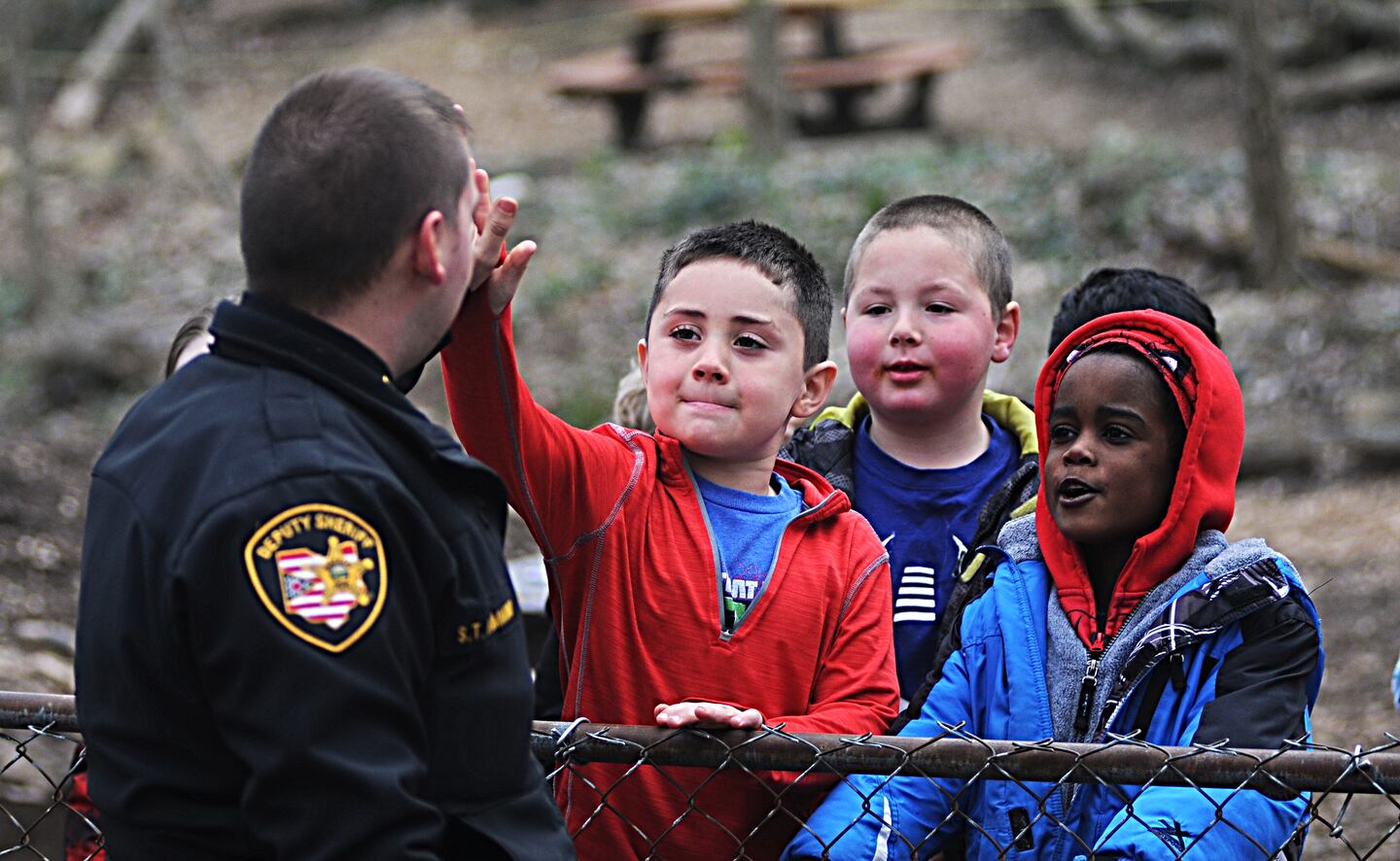 Montgomery County Deputy Scott Hammond high-fived students from the Gloria Dei Montessori School Monday on Shiloh Drive.