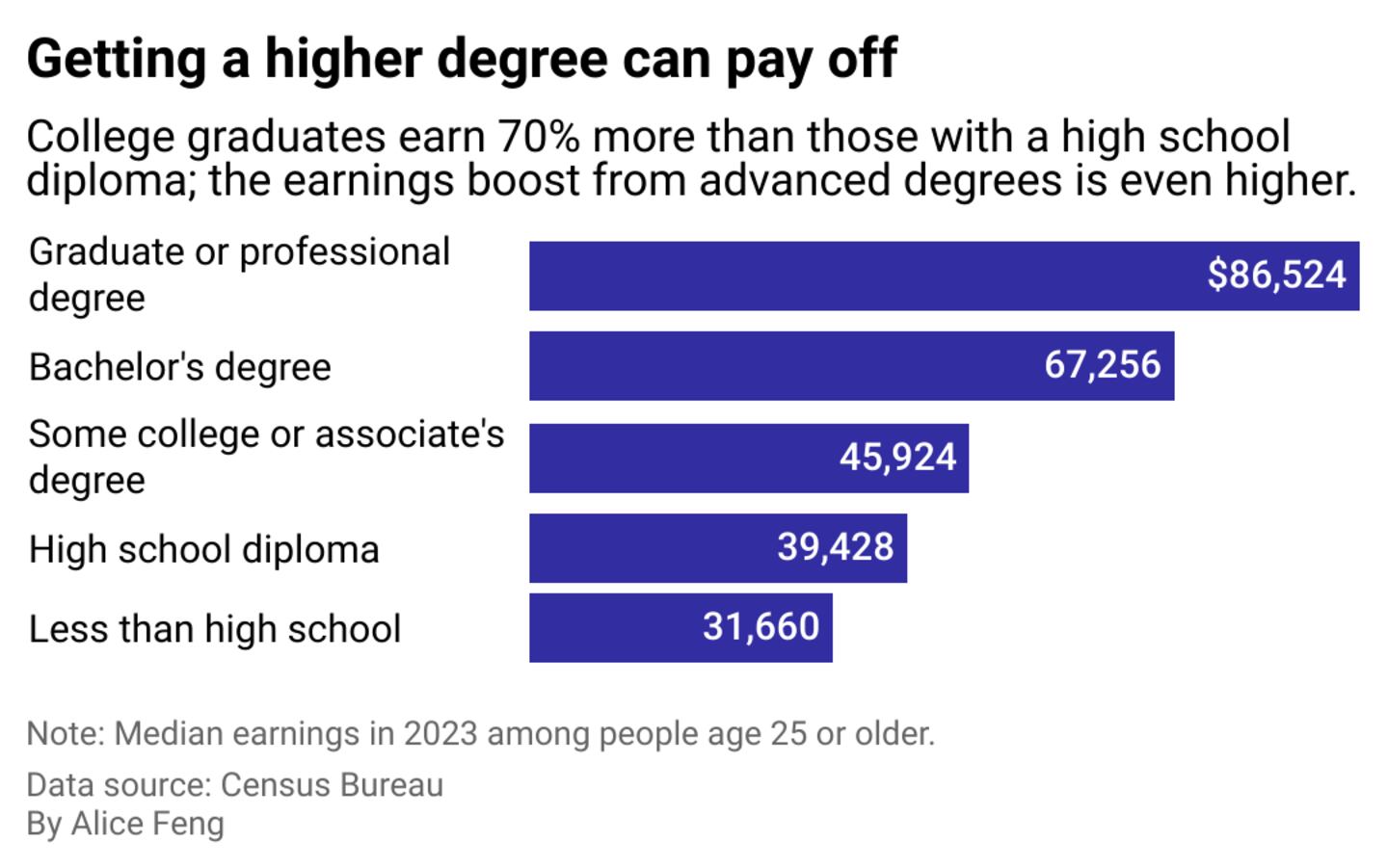 Nationally, college graduates earn significantly more than those with only a high school education or less. This wage gap has widened over time, too. An analysis by the Federal Reserve Bank of St. Louis found that in 1980, a college-educated worker earned about $10,000 more annually than a high school-educated worker by mid-career. But in 2020, this gap had grown to $18,000. Much of this difference is because jobs that high school graduates work in don't have much wage growth, whereas college graduates might see their salary increase significantly over the course of their career, according to a study by Harvard University's David J. Deming, published in the National Bureau of Economic Research.