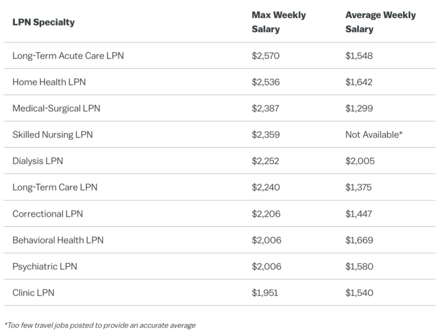 LPNs typically assist RNs and doctors, working under their supervision, and often have fewer specialty options. While they earn less than RNs, primarily because they have fewer training and education requirements, certain LPN specialties pay slightly more than others for those seeking a larger paycheck. The table above shows the highest-paying LPN specialties and average weekly salaries during this same period.