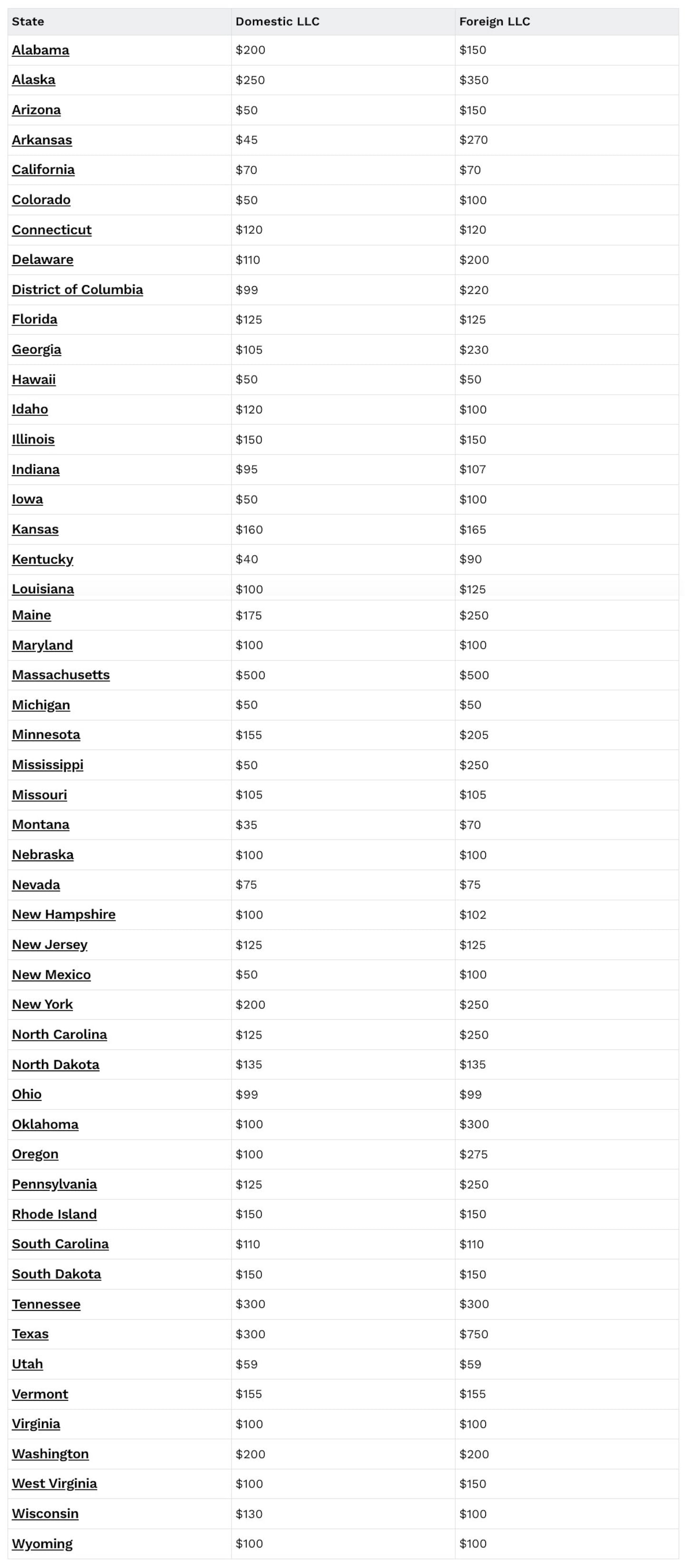 The state filing fees for LLC formation documents vary widely—from $35 in Montana to $500 in Massachusetts—though most states charge between $50 and $200. The cost may also be different if you are registering a domestic LLC (founded in the state) or a foreign LLC (founded in another state but licensed to do business in the new state).