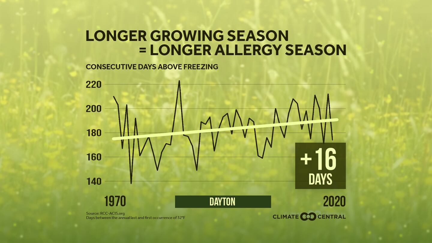 According to Climate Central, a non-profit organization that surveys and conducts scientific research on climate change, “rising temperatures from human-induced climate change are the dominant contributor to recent changes in the timing and length of the pollen season in North America”