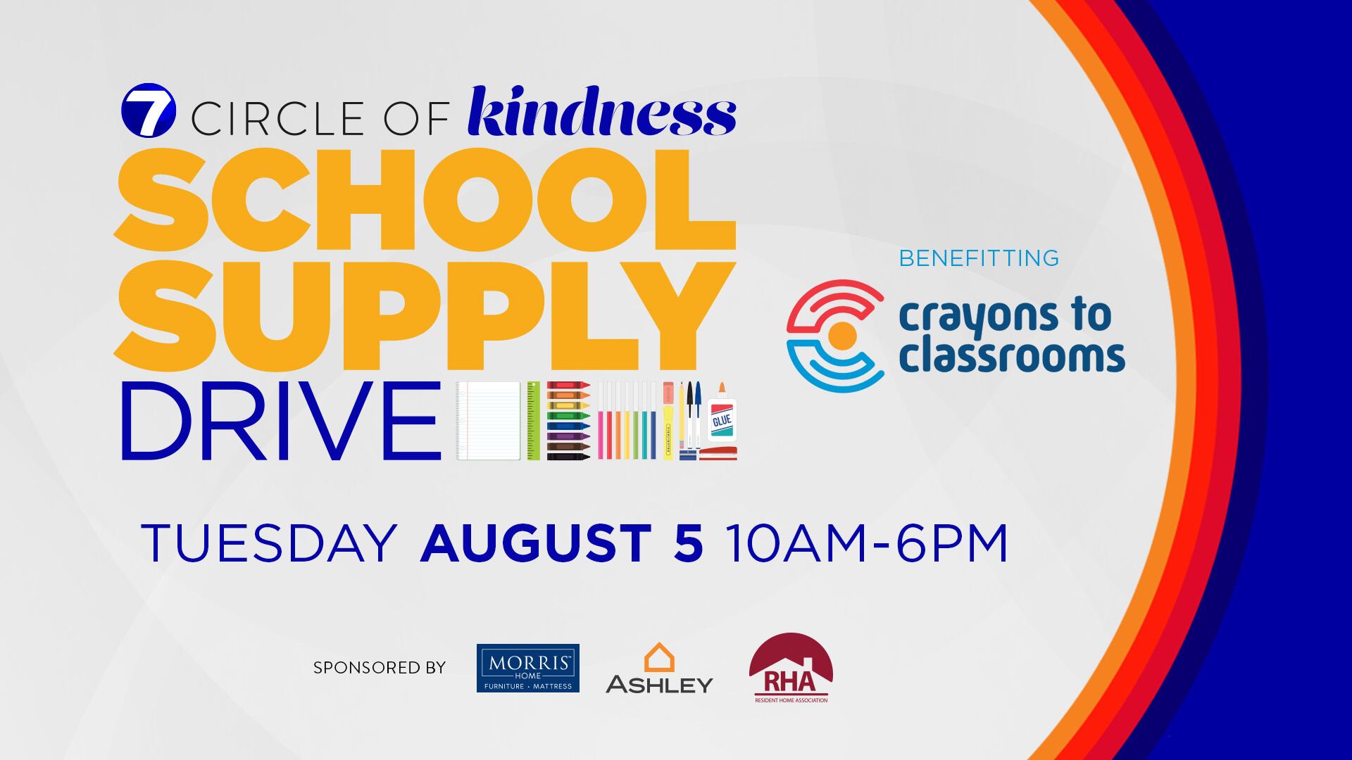 DAYTON — For the fourth consecutive year, the 7 Circle of Kindness School Supply Drive returns Today, August 5th, 2025, benefitting Crayons to Classrooms.