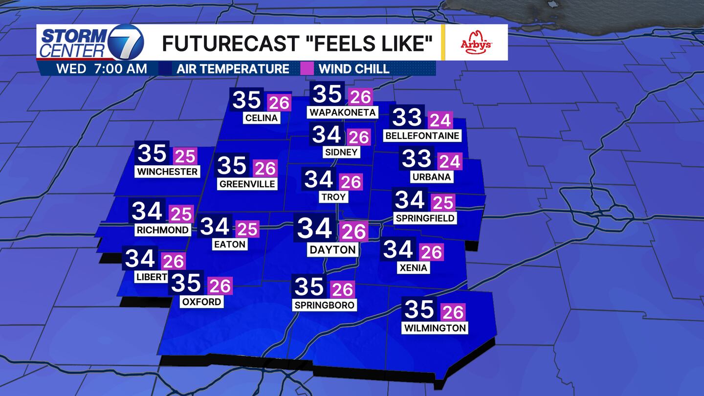 Now we will still have chilly, seasonable mornings in the mid 30s. Winds overnight Tuesday into Wednesday will keep temperatures “warmer.” That wind helps mix up the atmosphere. So instead of air temperatures in the low 20s like Tuesday morning, they will be right near freezing Wednesday morning. Wind chills will be in the 20s though.