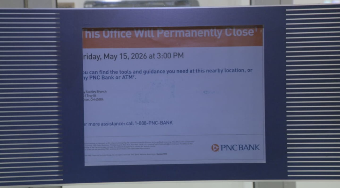 The PNC Bank, located in the 300 block of N Patterson Boulevard, will close on May 15 at 3 p.m.