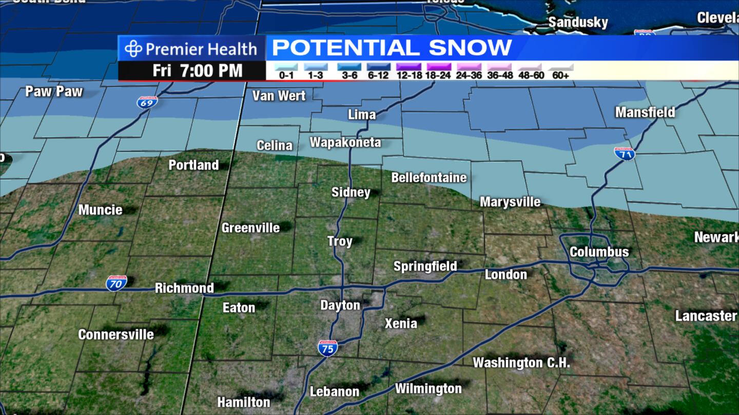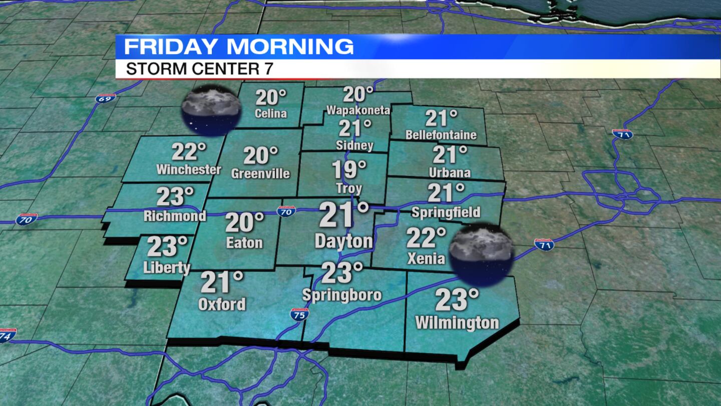Friday: Expect cloudy skies with a chance of a few sprinkles or drizzle. Some snow showers are possible, mainly early across the northern Miami Valley. Highs will rebound into the lower 40s.