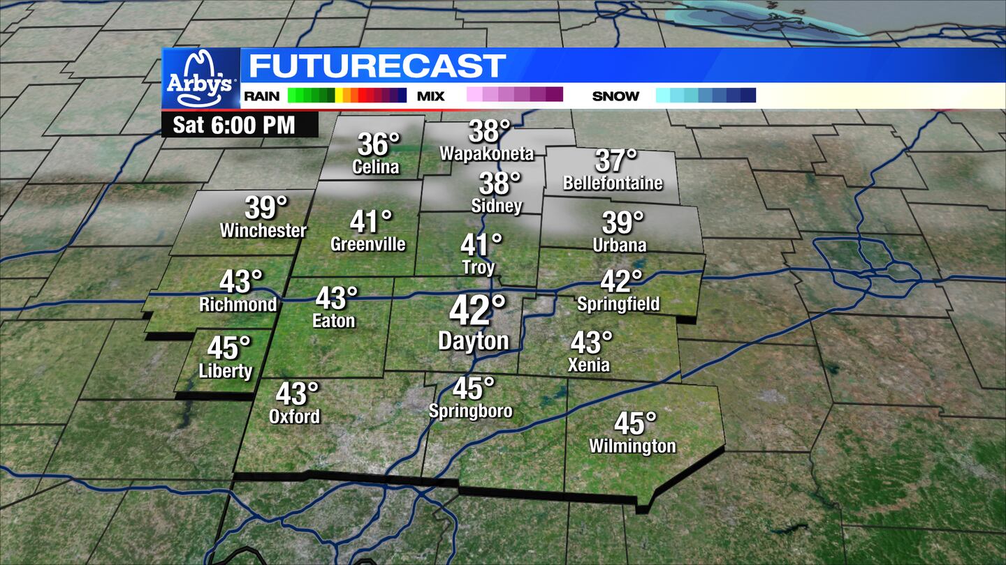 TUESDAY: A cold morning in the 20s. Clouds increase. Highs in the low 30s. Chance for a few snow showers in the southern Miami Valley, especially late.