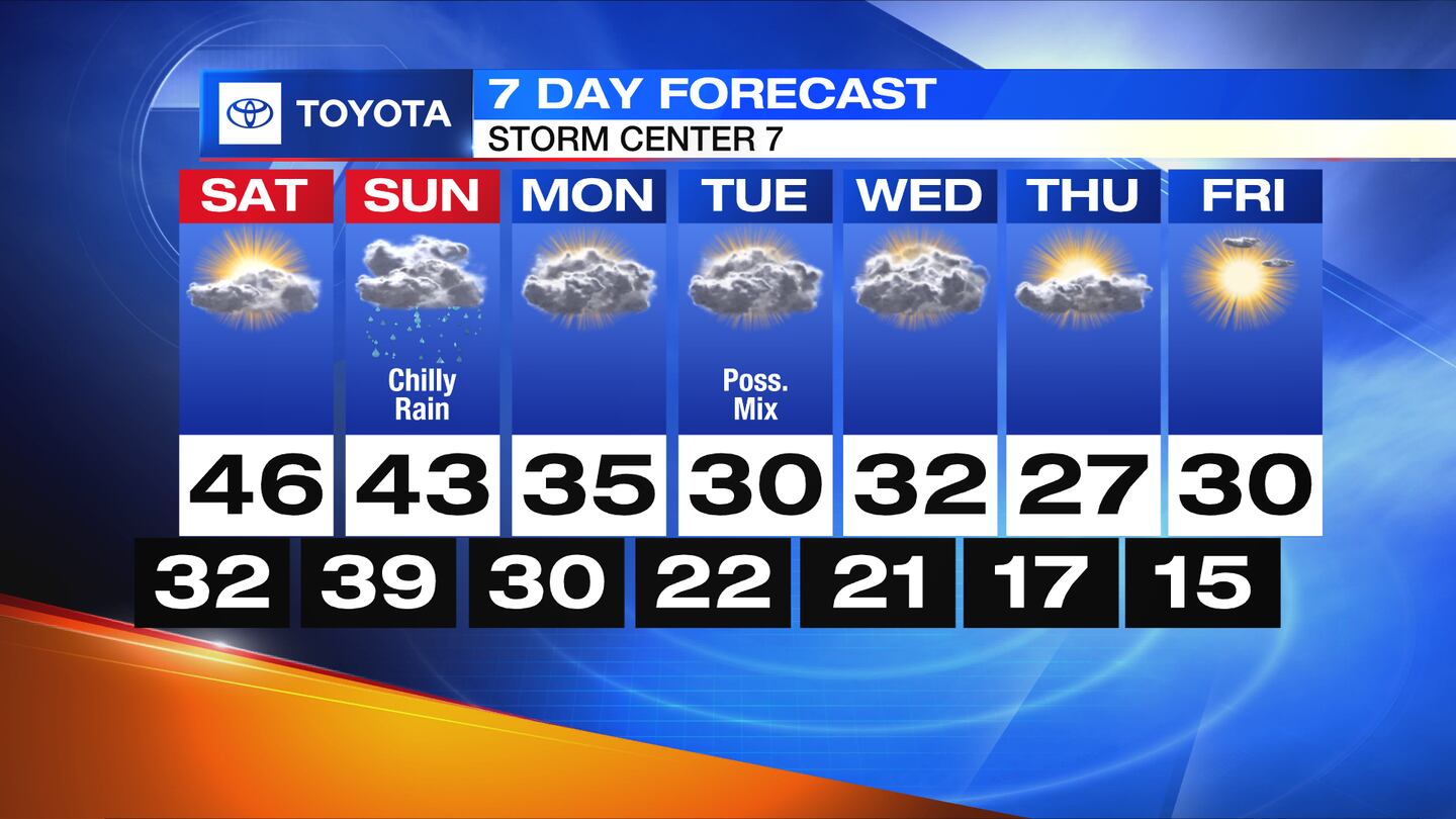 SUNDAY: A cool day in the low 40s. Passing showers in the morning and afternoon. Stray flurry possible late.