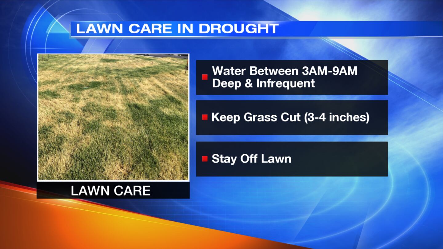 Watering during the early morning hours will be beneficial because it lessens evaporation. The best times will be from 3:00 AM to 6:00 AM. Keeping the grass cut on the longer side, between three to four inches will help with the water sinking into the soil and provide shade. Simply staying off the lawn will also reduce stress.