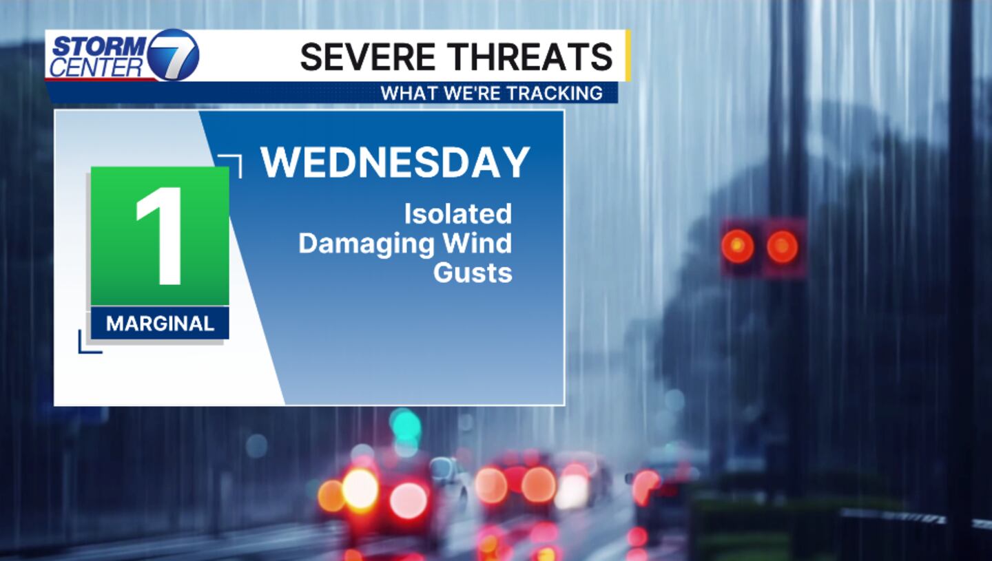 The Storm Prediction Center has areas mainly south of Interstate 70 under a marginal risk for severe weather (Level 1 of 5).