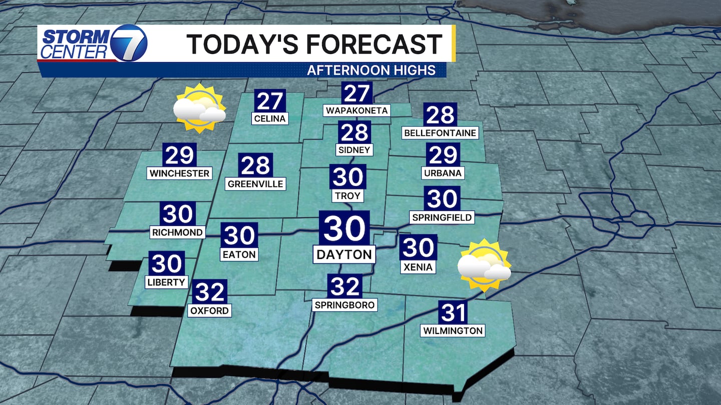 DAYTON — Good morning to all of you on this Friday! Meteorologist Nick Dunn here on what is the coldest start to any morning this season. Wapakoneta dropped to a low of -2 degrees this morning, while Dayton recorded a low of 12. Clouds helped us “warm” a bit overnight, but for early December this is definitely cold!