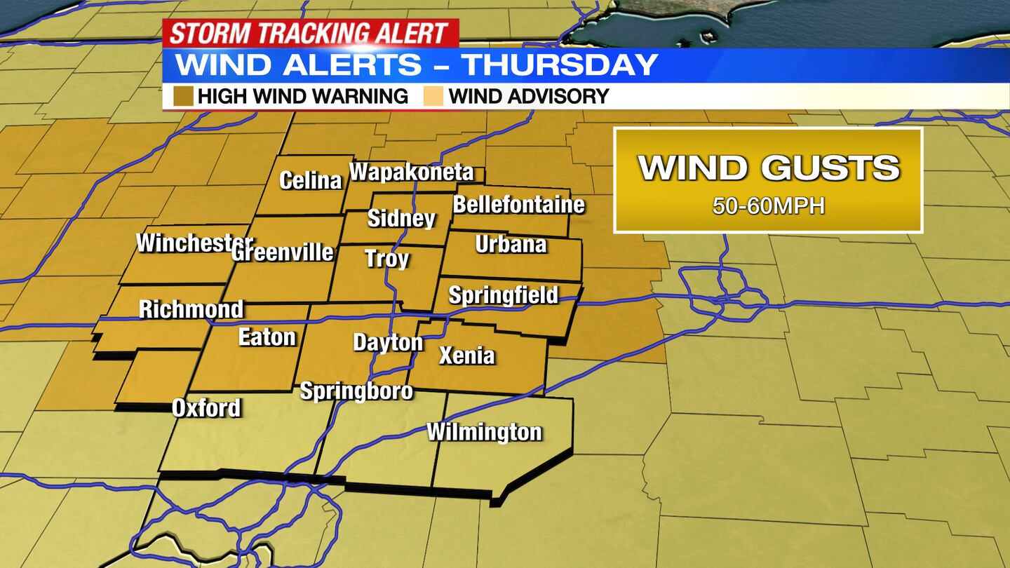 High Wind Warning issued for Auglaize, Champaign, Clark, Darke, Greene, Logan, Mercer, Miami, Montgomery, Preble counties in Ohio and Wayne County, Indiana for Thursday until 7 p.m.