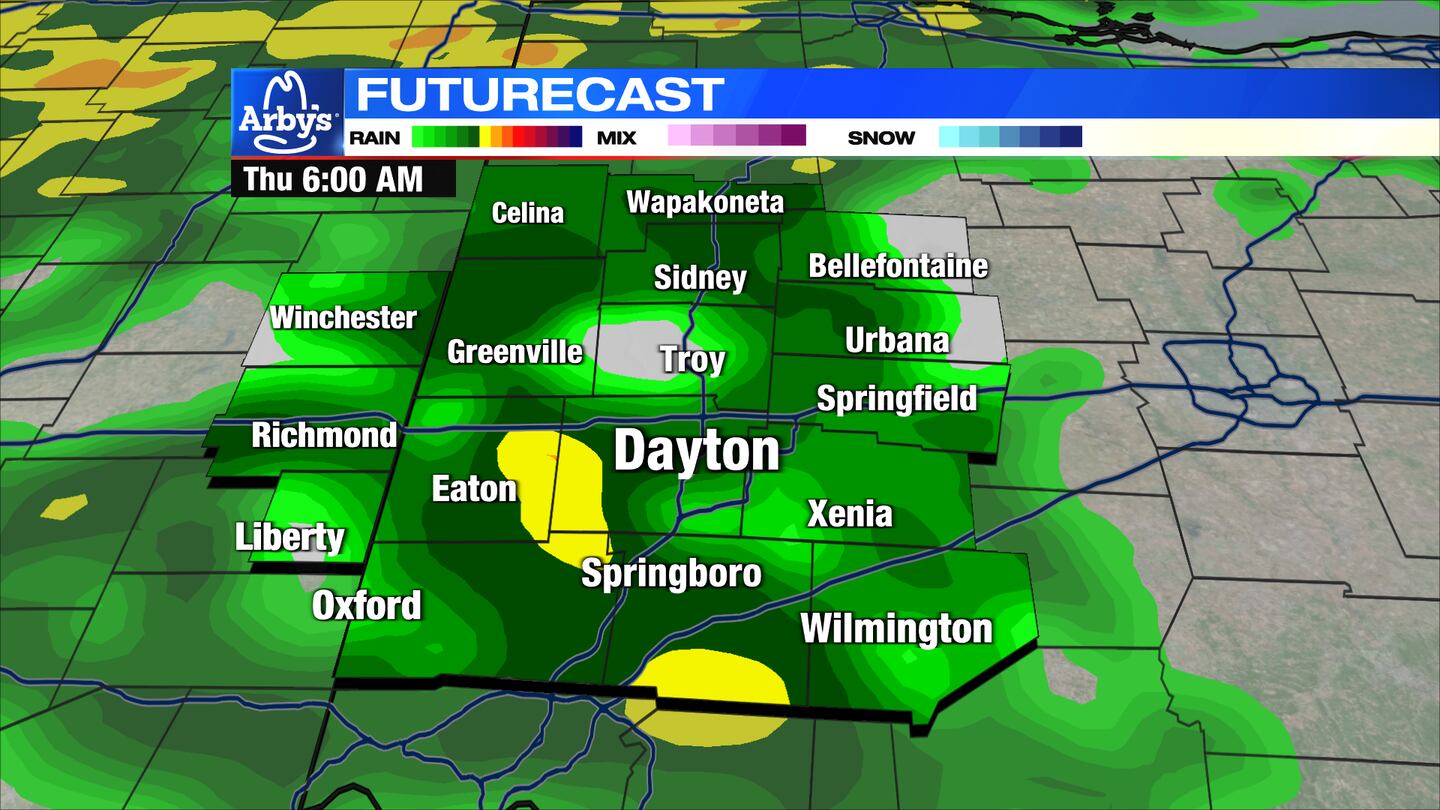 TOMORROW: Widespread rain in the morning and then isolated downpours and a stray storm possible off and on through the early afternoon Thursday.