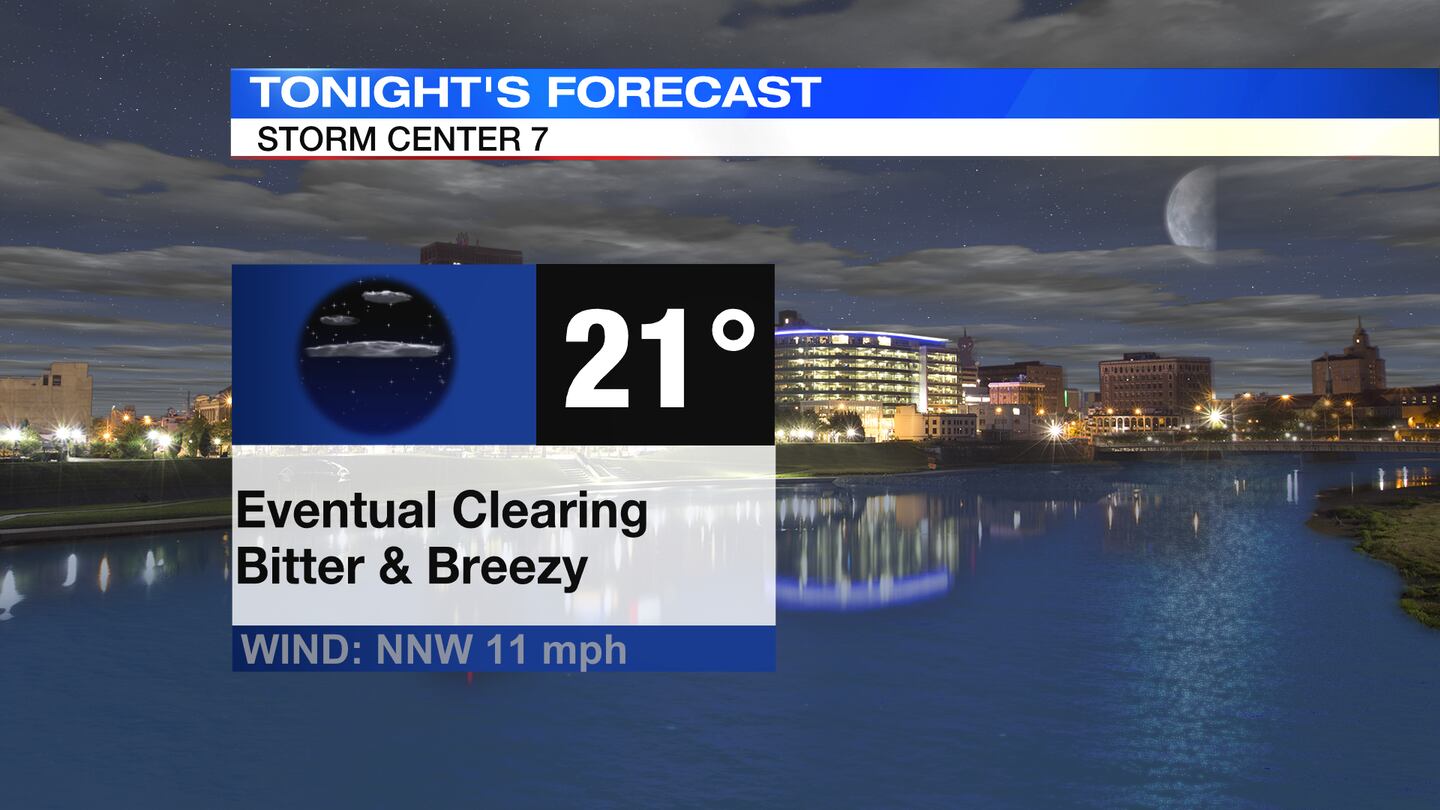 TONIGHT: Flurries fade and clouds will eventually clear as winds diminish.