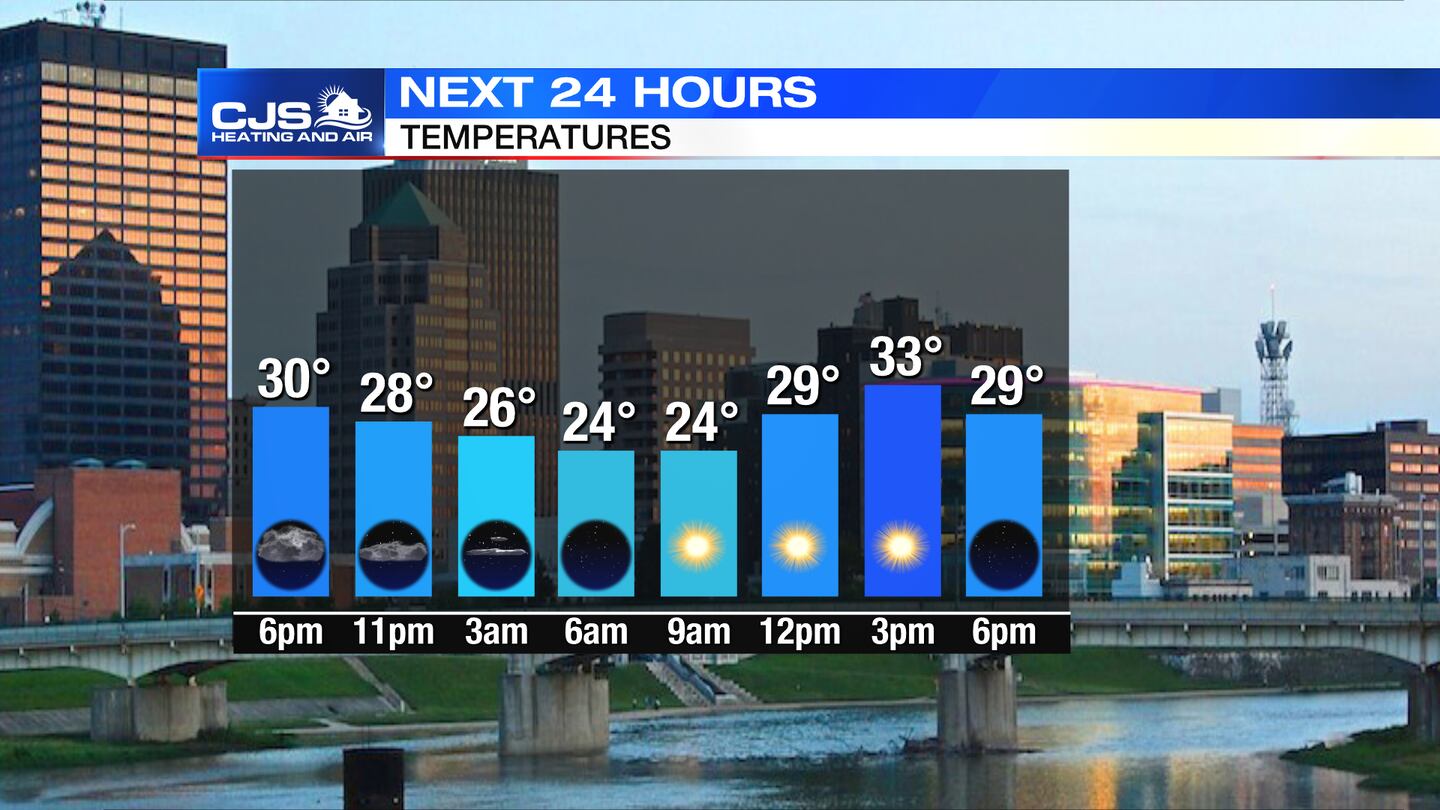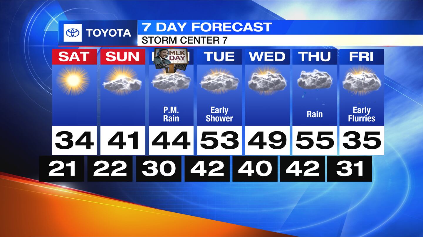 SUNDAY: Another cold morning in the 20s, but temperatures will be a bit milder for the afternoon as they reach the lower 40s. Sunshine early will give way to more clouds throughout the day.