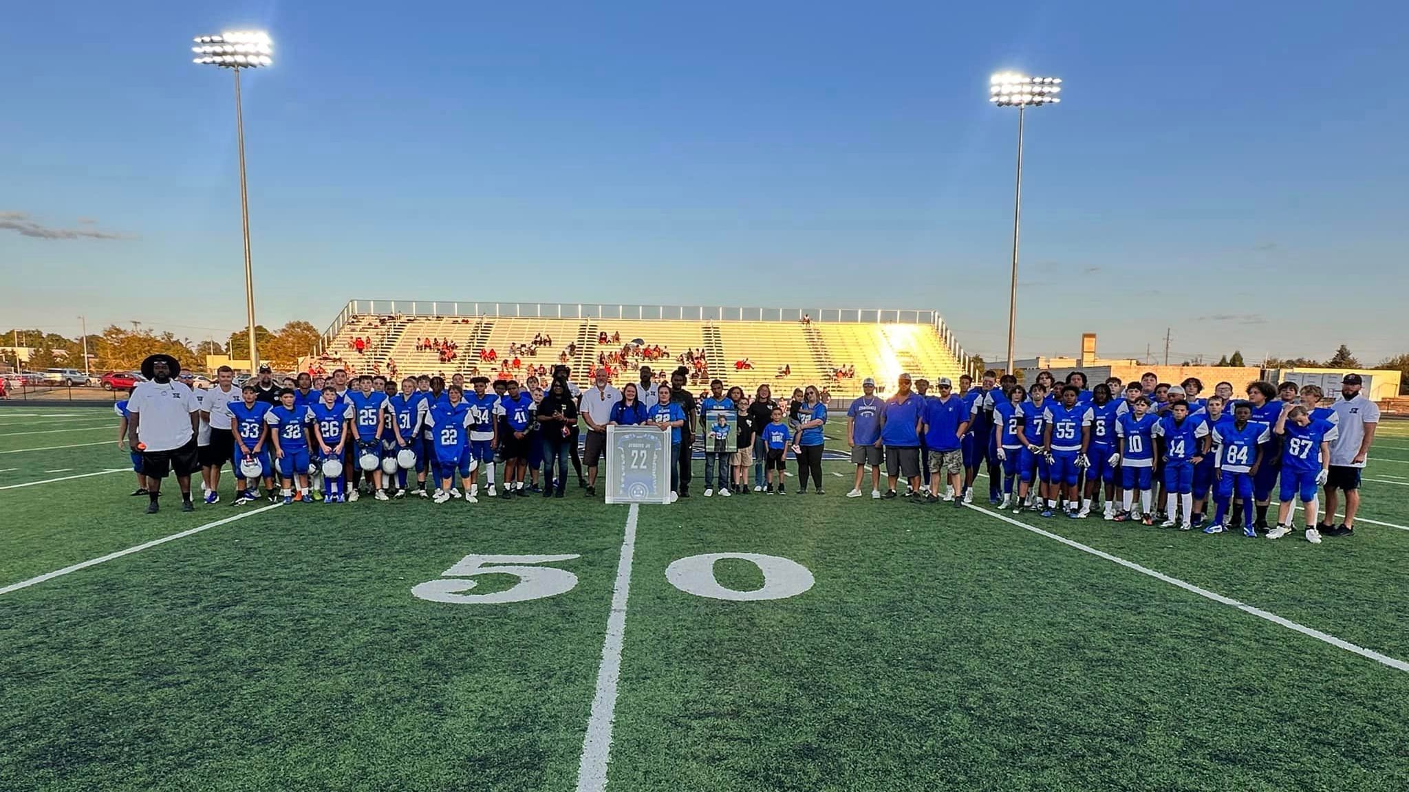 The Xenia Wee Bucs Football and Cheer and the Xenia Browns Backers presented a jersey to memorialize 11-year-old Kevin Jenkins Jr. during the intermission of the 7th and 8th grade Warner Middle School football games.